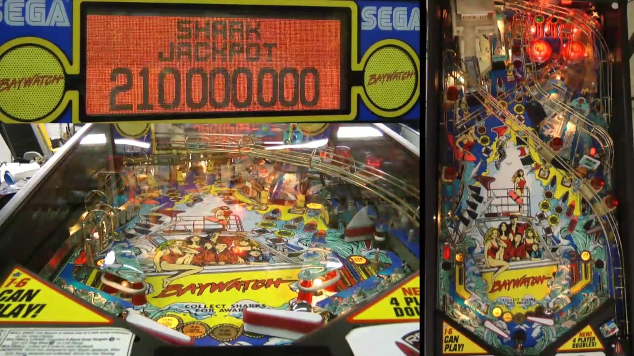 The "Baywatch" pinball machine, released by Sega in February 1995, features a design inspired by the popular TV series. This machine includes four flippers, three pop bumpers, and a variety of targets, including a shark-shaped flipper and a lifeguard tower ball lock.