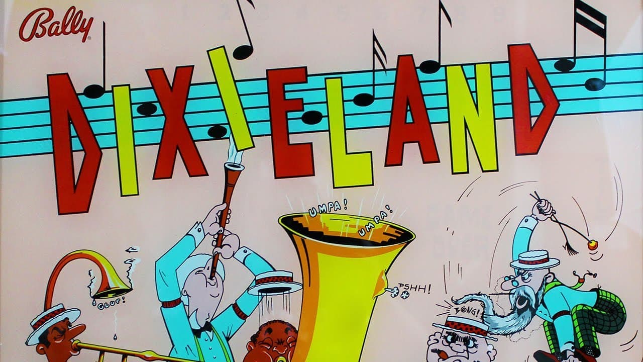 The Dixieland pinball machine, released by Bally Manufacturing Co. in 1968, is an electro-mechanical game designed by Ted Zale with artwork by Christian Marche. This single-player machine features two flippers and is known for its colorful New Orleans-themed backglass artwork, evoking a jazz music vibe.