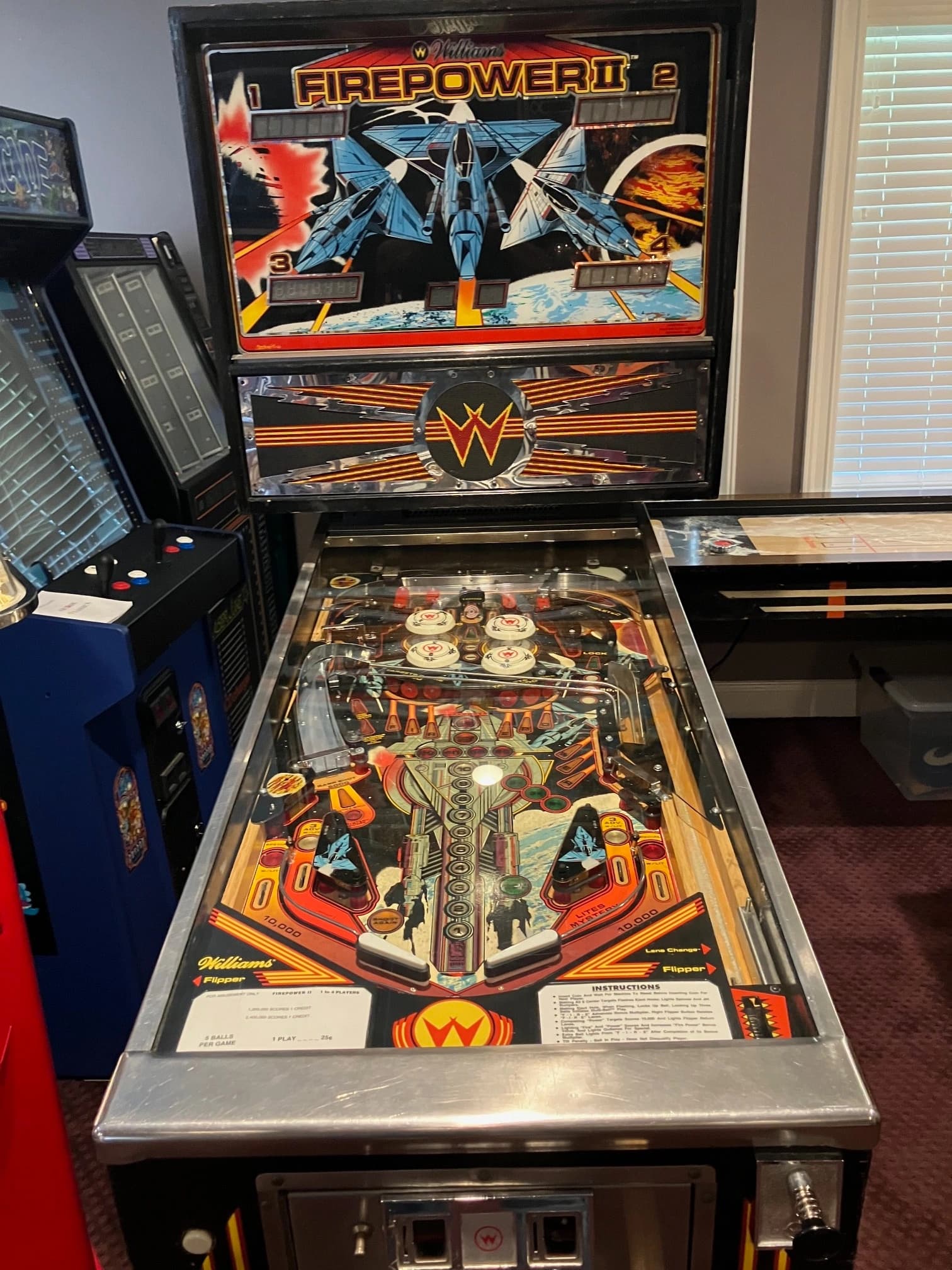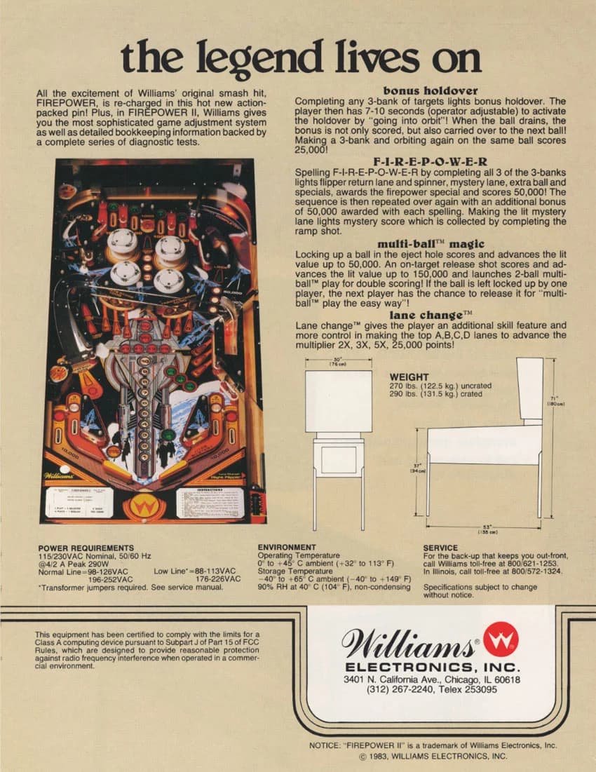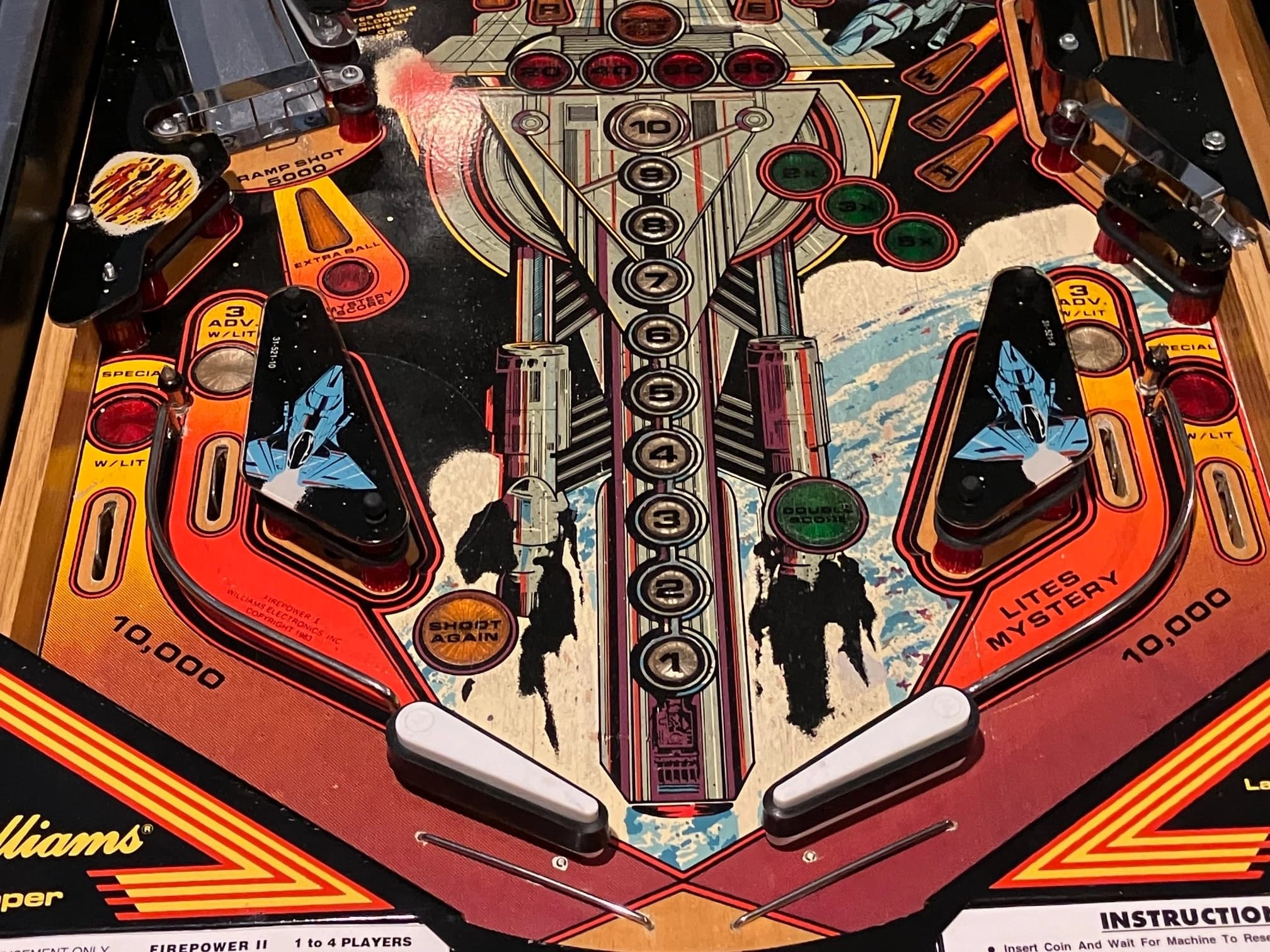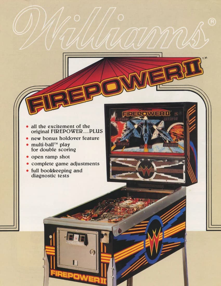 The "Firepower II" pinball machine, released by Williams in August 1983, is a sequel to the original "Firepower" and features a space-themed design by Mark Ritchie. This solid-state electronic game includes notable features such as two flippers, four pop bumpers, ten standup targets, a kick-out hole, a rollunder spinner, and a single ramp, along with a two-ball multiball mode.