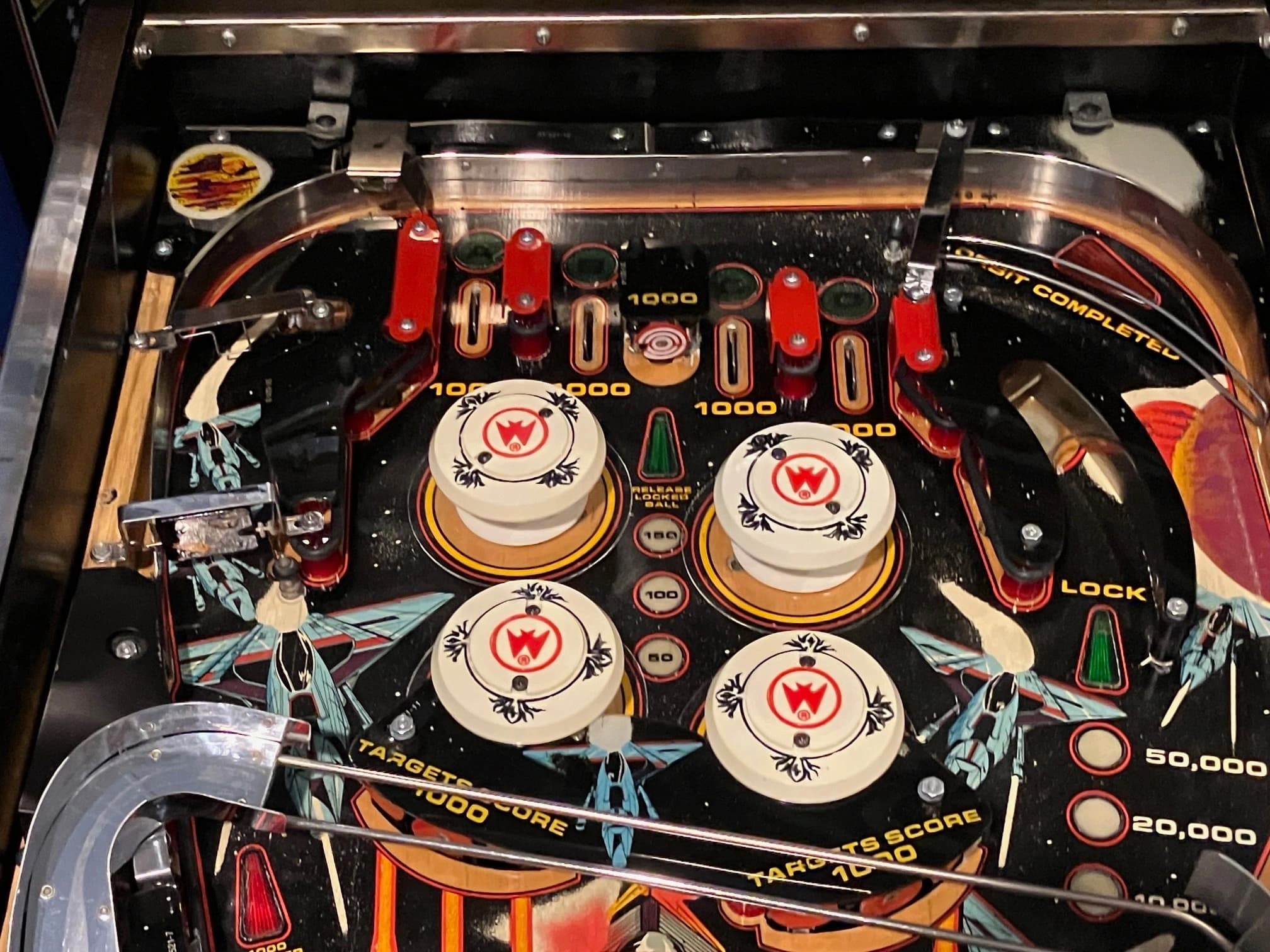 It may look like it’s parent, Firepower, but the strategy is totally different. Firepower was all about the stand-up targets and the spinner; Firepower 2 is all about multiball and the top lanes. Multiball is only a 2-ball here, but the lock saucer near the upper right is always lit during single-ball play; lock a ball, then hit the top center release target to start multiball. Scoring is doubled during multiball. The lock saucer value goes up to the next level each time you lock a ball in it – 10K, 20K, 50K. The release value goes up each time you play multiball, too – 50K, 100K, 150K. Play multiball 3 times, which requires only two shots per, and you get 200K each time you start it thereafter! Bonus is the other source of big points. Base bonus is raised by the nine standup targets (1 per flashing target) and top A-B-C-D lanes (2 per lane, lit or not), up to 99K. Completing the top four lanes also raises your multiplier which goes up to 5X, so there’s a possible massive 495K in bonus. Remember to use the lane change with the flipper buttons to help get unlit top lanes. Top lane completions score 25K once your bonus multiplier is maxed. Bonus and multiplier reset each ball. The release light will stay on if lit. Release and lock saucer values carry over. As for the FIREPOWER targets, completing them lights the spinner and return lanes. Bumpers are lit when you get any set of three letters FIR, EPO or WER. This also lights the orbit shot to hold bonus, but only for 7-10 seconds; make sure to shoot it when lit! If you get hold bonus on your last ball, it gives you one extra bonus amount but with no multiplier. Orbit scores 25K when not lit. While useful, spinner and bumper points can’t win out over multiball and bonus here. My recommended strategy is to ignore both the firepower letters and left ramp; you should get plenty of letters randomly during multiball, and the ramp is of little value. Just lock balls, play multiball and go up top. Once you have 5X, it’s okay to shoot the spinner all day if lit. Observe that when the left orbit is lit, you need to shoot up the right side instead to get the ball to go into the top four lanes, since left orbit shots go on through. Firepower 2 typically plays extremely fast – faster than the original Firepower. Key feeds: the return from the left-to-right orbit shot and the rebound from the Release shot. It really sucks when you shoot the release to start multiball only to have the ball bounce off that target and go straight down the middle, ending multiball before it even starts.