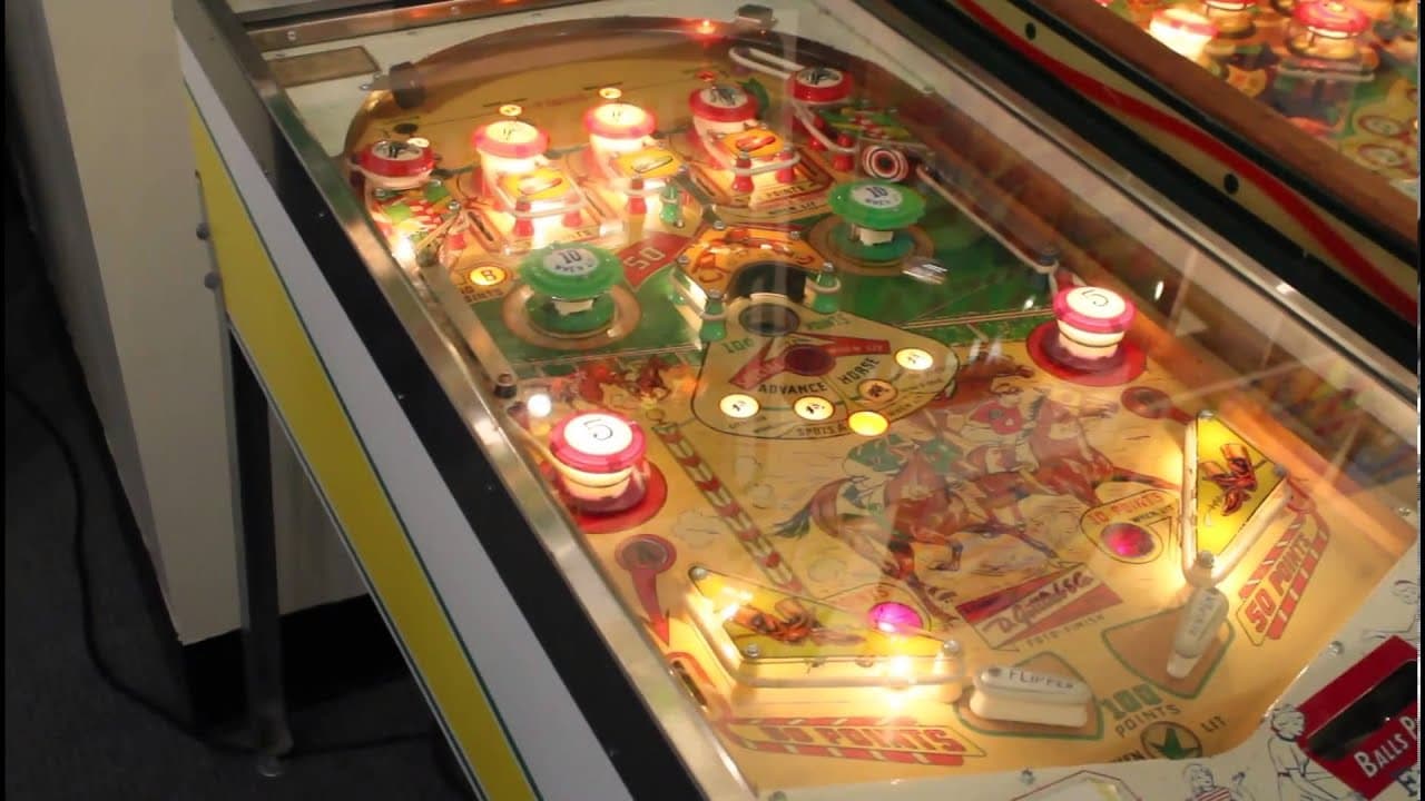 "Foto Finish," released by D. Gottlieb & Co. in January 1961, is a one-player electro-mechanical pinball machine with a horse racing theme. Designed by Wayne Neyens with artwork by Roy Parker, it features two flippers, two pop bumpers, seven passive bumpers, and a single gobble hole. The game includes a "score-to-beat" window, where operators could set a challenging score for players to surpass.
