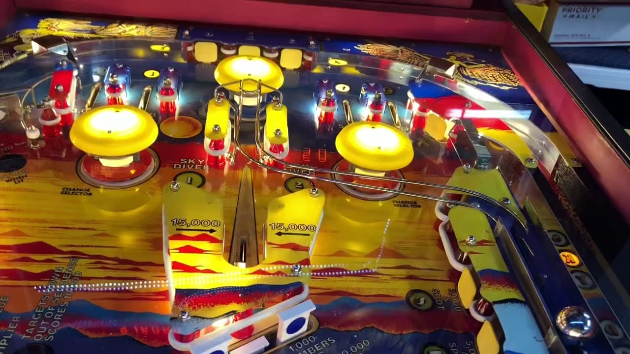 "Freefall" is a pinball machine released by Stern Electronics in January 1981, featuring an aviation theme. It includes two flippers, no ramps, and supports a three-ball multiball mode. Designed by Harry Williams with artwork by Bob Timm, it was produced in a limited run of 1,300 units.