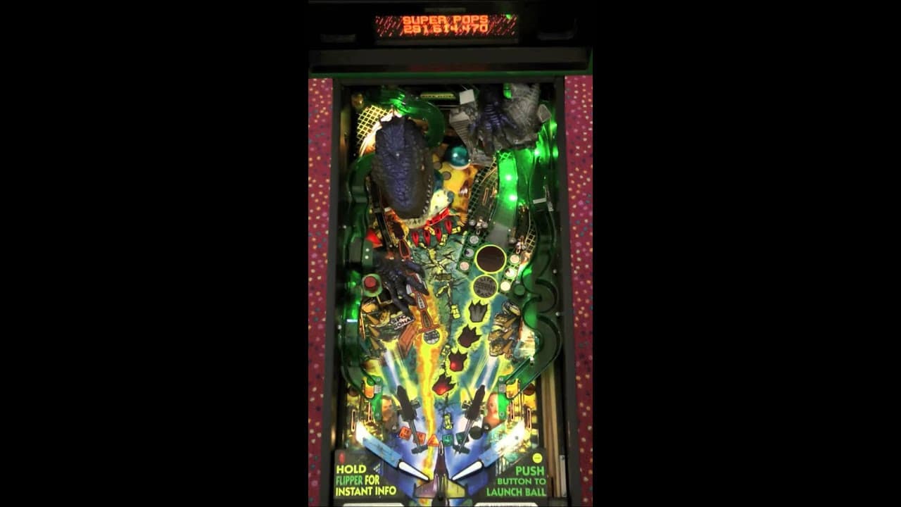 The "Godzilla" pinball machine, manufactured by Sega in 1998, is based on the Godzilla movie released that same year. Designed by Joe Balcer and Joe Kaminkow, with artwork by Morgan Weistling, this machine features several notable elements, including a large Godzilla toy on the playfield, a ball diverter that drops the ball out of Godzilla's mouth, four electromagnets under the playfield, and a shaker motor that adds to the immersive experience. The game was one of the last produced by Sega Pinball before the company transitioned to Stern Pinball.