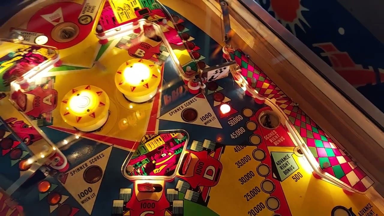 This is one of many top players’ favorite EMs, even though it’s largely a UTAD spinner-all-day game. Skill Shot is to get the ball in the top saucer for 5K and a bonus advance. The ball will kick out towards the right bumper. You want to nudge to try to get the ball to knock down the A and B targets above and outside the bumpers. A+B lights double bonus. If you’re at a lower-level tournament or league where extra balls are on, getting A+B twice lights a return lane for an EB, three times awards the EB outright. If EBs are off, ignore the A and B targets once you have double bonus lit. While the top saucer and the two middle-of-the-sides mini-slings below the side bonus-collect saucers each gives a bonus advance, the best way to advance the bonus is to shoot the spinners. There’s a second reason to do so: once the bonus for a side is maxed out at 50K [100K if doubled], the spinner value jumps from 100 per spin to 1,000 per spin. Most Grand Prixes have pretty active spinners, so this can be worth 20-30K per shot once lit. When you collect bonus on either side, that side’s spinner reverts to the 100-per-spin value. You can rebuild the bonus, of course, and collect it many times per ball. Let’s look at the math, though. Every 5 spins advance the bonus by one notch of 5,000. Thus, it takes 50 spins to max out the bonus at 50K. 50 spins when the spinner is lit is also worth 50K. There’s nothing to be gained by collecting an undoubled bonus vs. continuing to shoot the spinner. When you have double bonus lit, though, collect it whenever you can and then go back to the spinners to refill it. Your 50 spins to refill the bonus are worth 100K in this case, assuming you either eventually collect that side saucer or that side’s arrow is lit when the ball drains - - the end-of-ball collect bonus applies to whichever side’s arrow is lit at the time. Ball control: use dead bounce passes a lot. [See video of Circuit Final.] Less-than-perfect live catches tend to roll up the flipper and drain out the gaps above the return lanes. Shatz passes are clearly impractical for the same reason, and post passes aren’t really necessary, just shoot either spinner. Note to TDs: this game has a tendency to “skip” 100,000’s either when counting down side bonus collects or making a really zippy spinner shot. Check to make sure the scoring reels advance properly. Key feeds: kickouts from the collect bonus side saucers. Can you let them dead bounce safely or not?