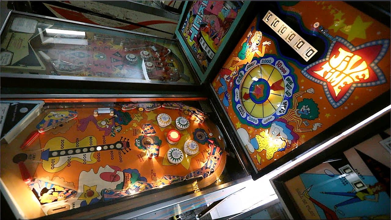 The Jive Time pinball machine, released by Williams in April 1970, features a music theme with a retro "hippie" vibe. Designed by Norm Clark with artwork by Christian Marche, it was produced in two versions: the replay version as Jive Time and the add-a-ball version as Rock 'N Roll. Both versions have similar mechanics, with two flippers, five pop bumpers, nine standup targets, and a unique backbox animation where a spinning arrow indicates various awards.