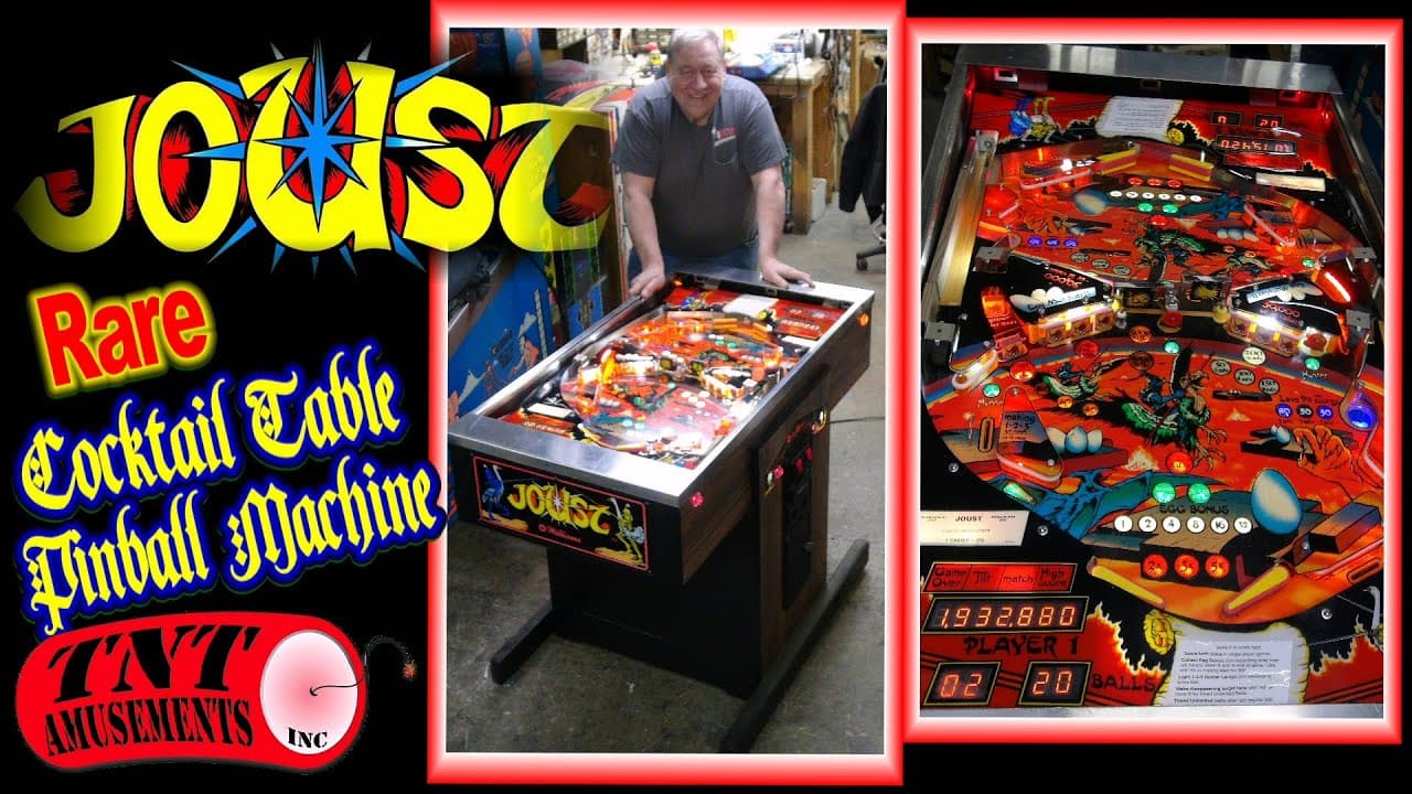 "Joust" is a unique head-to-head pinball machine released by Williams in April 1983, designed for two players to compete simultaneously on opposing sides of the playfield. It features four flippers, no ramps, and supports a four-ball multiball mode. Designed by Barry Oursler with a total production of 402 units, it is known for its competitive gameplay and rare design.