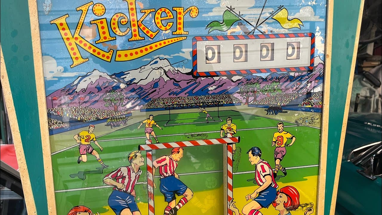 "Kicker," released by Chicago Coin Machine Mfg. Co. in August 1966, is a single-player, electro-mechanical pinball machine with a soccer theme. Designed by Jerry Koci, it features two flippers, three pop bumpers, two slingshots, two kick-out holes, and three messenger balls. The backglass includes light animation depicting a player kicking a ball, enhancing the thematic experience.