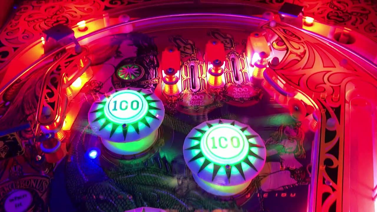 Two major things here, bonus and the saucers. The simpler is the saucers - - the value goes up each time you make the shot, 1K-2K-4K-6K-8K-10K, then stays at 10K after one pause for a special. If the kickout from the saucers is good, you can just repeat them all day for lots of points. The bonus method involves hitting all four letter standup targets and the two lanes, A and B, at the top. C+D lights double bonus; C+D+E+F lights triple bonus; add A and B for all six to get 5X bonus. A+B+C+D lights the extra ball captive ball, but that’s only worth shooting at if EBs are active. Lanes, the six letter targets and the spinner all advance your base bonus, to a maximum of 29K. By the time you get all six letters via shots at the targets and to the top through the spinner, you’ll probably be at least halfway there; don’t worry about your base bonus, let it happen. Your maximum overall bonus is 5X29K or 145,000. Key feeds are the kickouts from the two saucers; you’ll need to determine whether to dead bounce, live catch, hold up a flipper or something else to get control of the ball after one, and they’ll likely be different from each side.