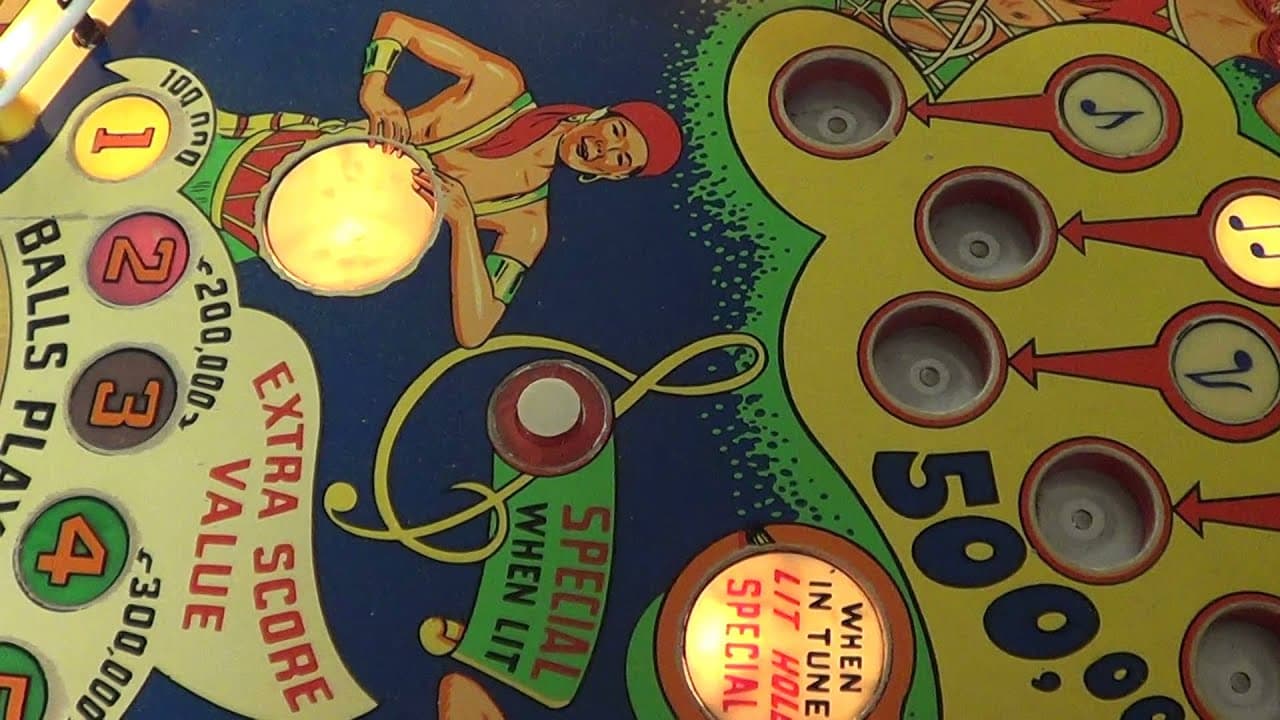 "Lovely Lucy," released by D. Gottlieb & Co. in February 1954, is a single-player, electro-mechanical pinball machine designed by Wayne Neyens, with artwork by Roy Parker. The game features a musical theme, with the backglass depicting a lively scene of musicians and dancers. The playfield includes two flippers, three pop bumpers, seven passive bumpers, two slingshots, and six gobble holes.