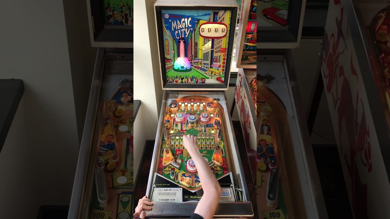 Magic City and Magic Town are two classic electro-mechanical pinball machines produced by Williams in 1967, designed by Norm Clark with artwork by George Molentin. While Magic City was the replay version, Magic Town was the add-a-ball variant. Both machines share a vibrant, city-themed playfield, with imagery showcasing Chicago's LaSalle Street and the Space Needle in Seattle.