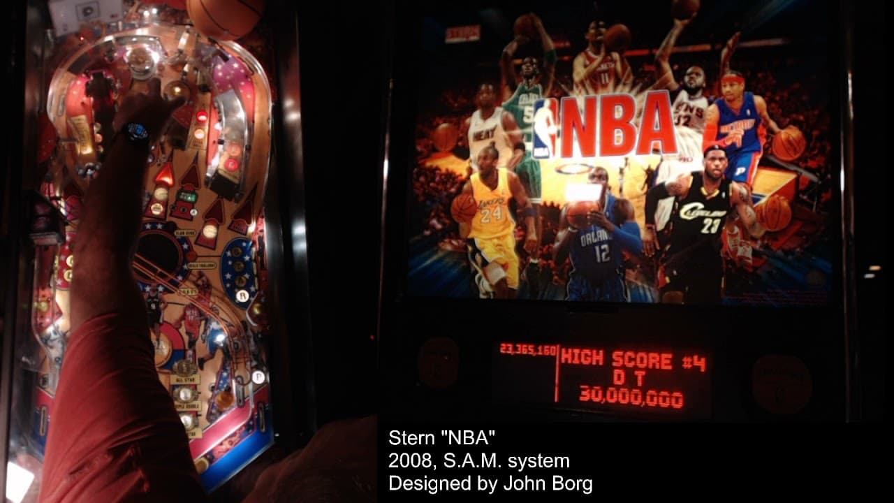 The "NBA" pinball machine by Stern Pinball, released in 2009, is themed around basketball and designed by Gary Stern, Ray Tanzer, and John Borg. This game features two flippers, nine standup targets, a spinning disc, and a unique ramp system that shoots the ball towards a hoop.