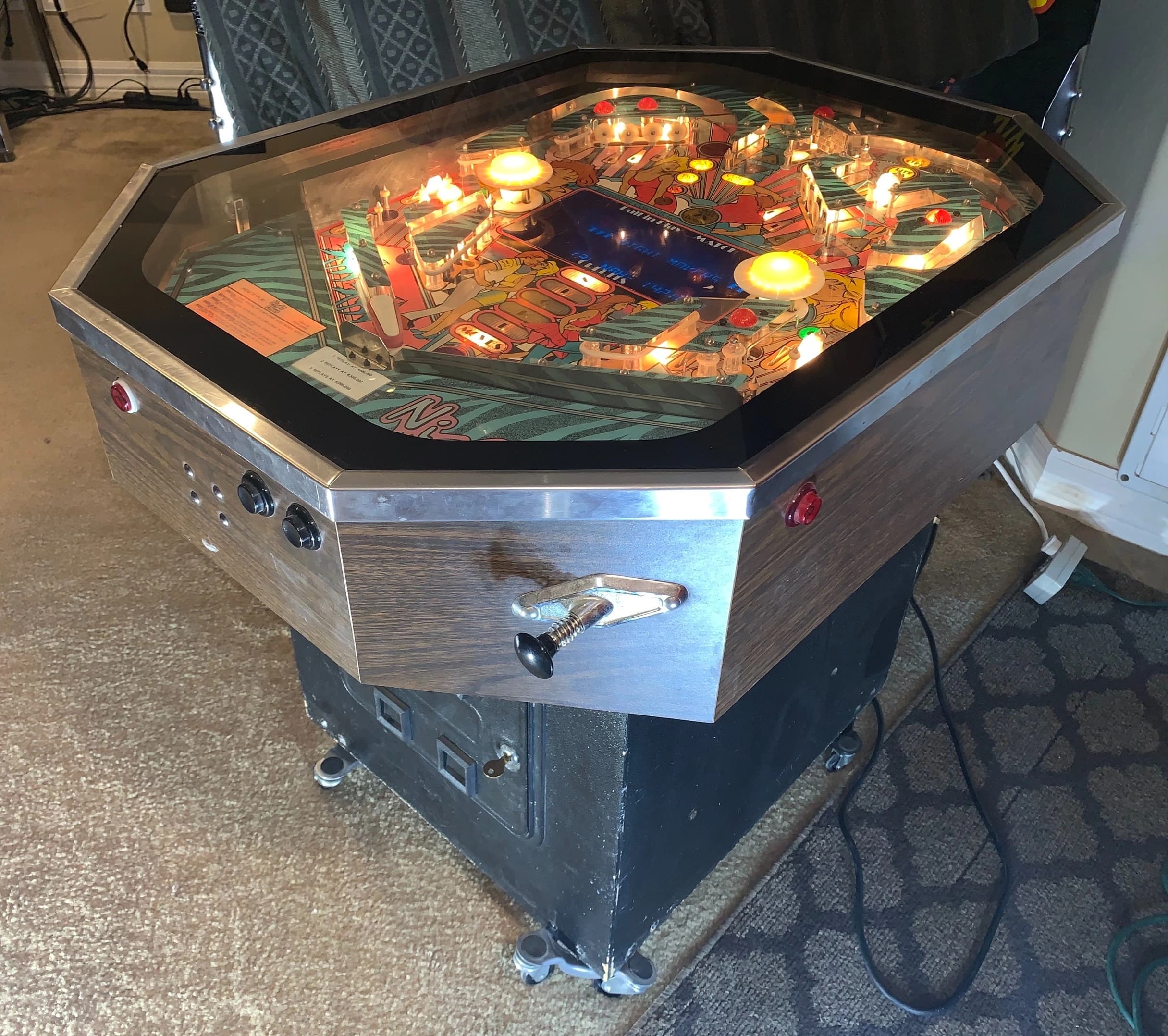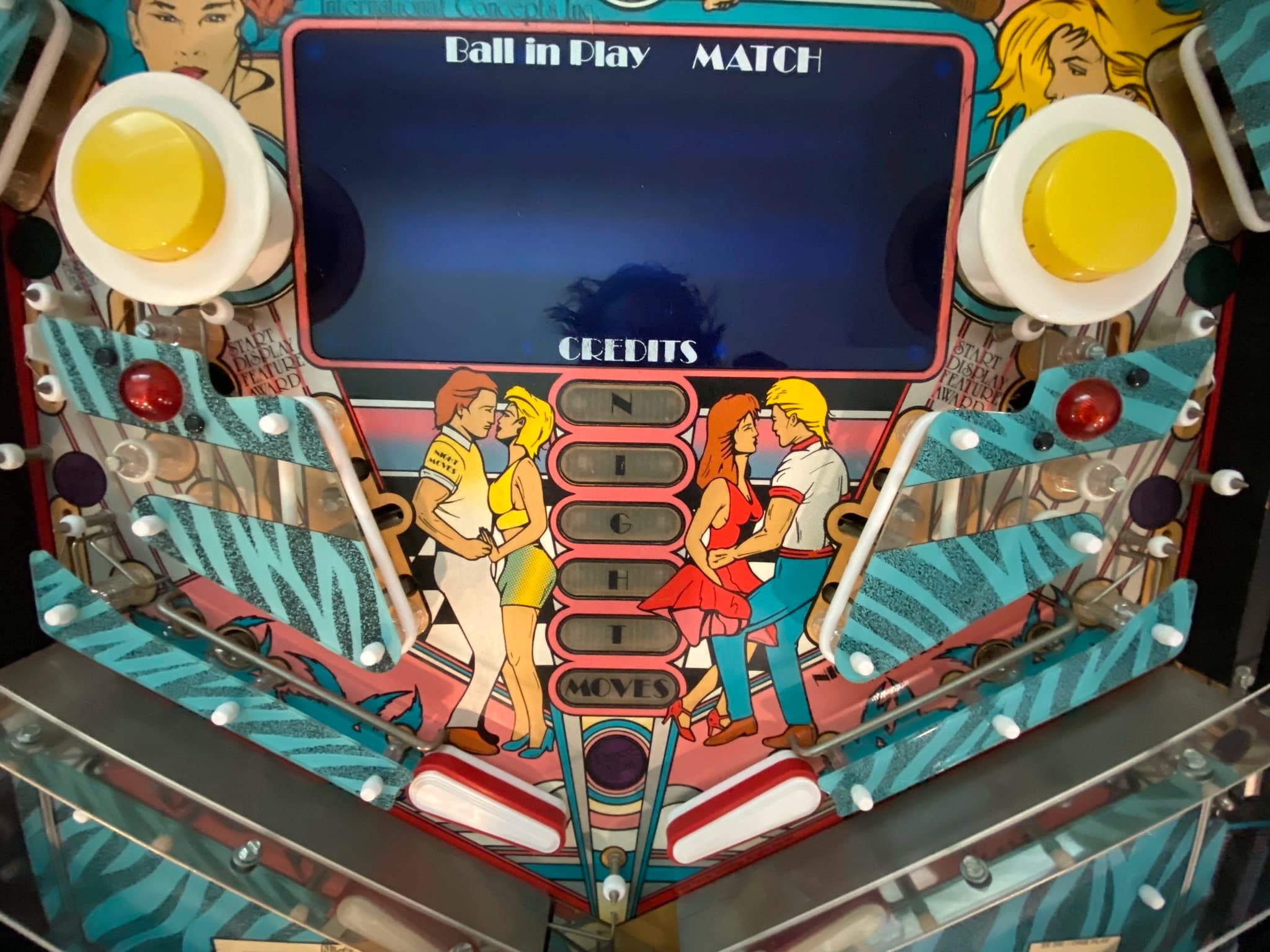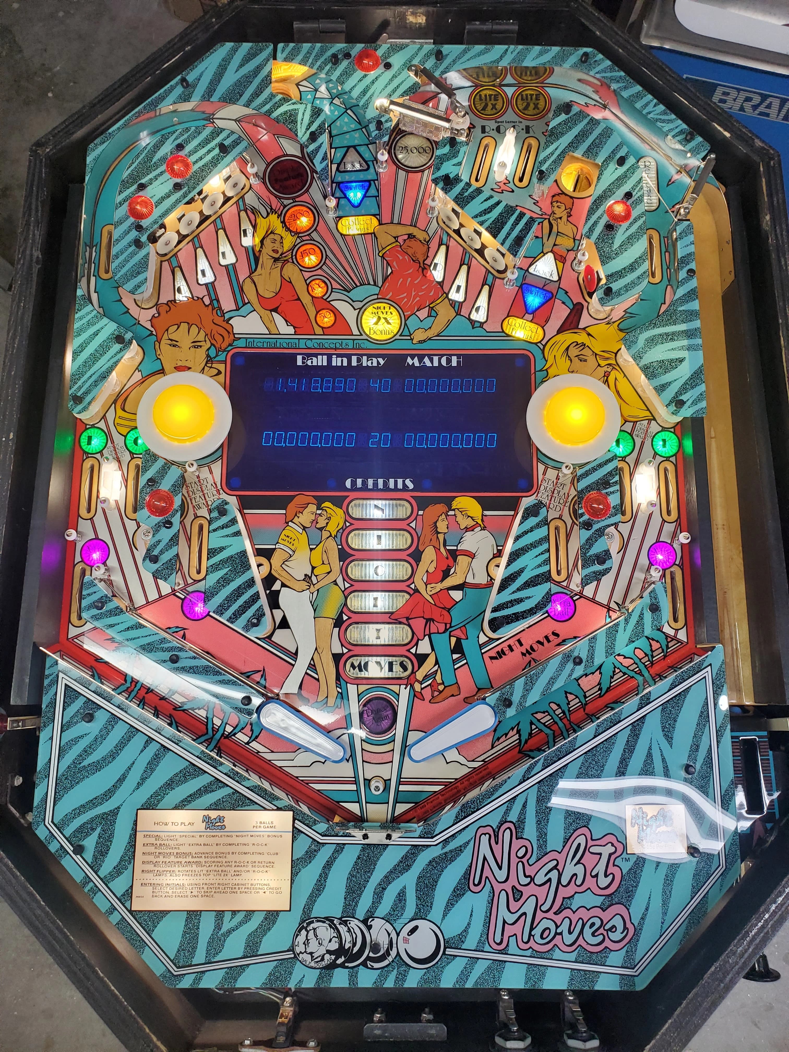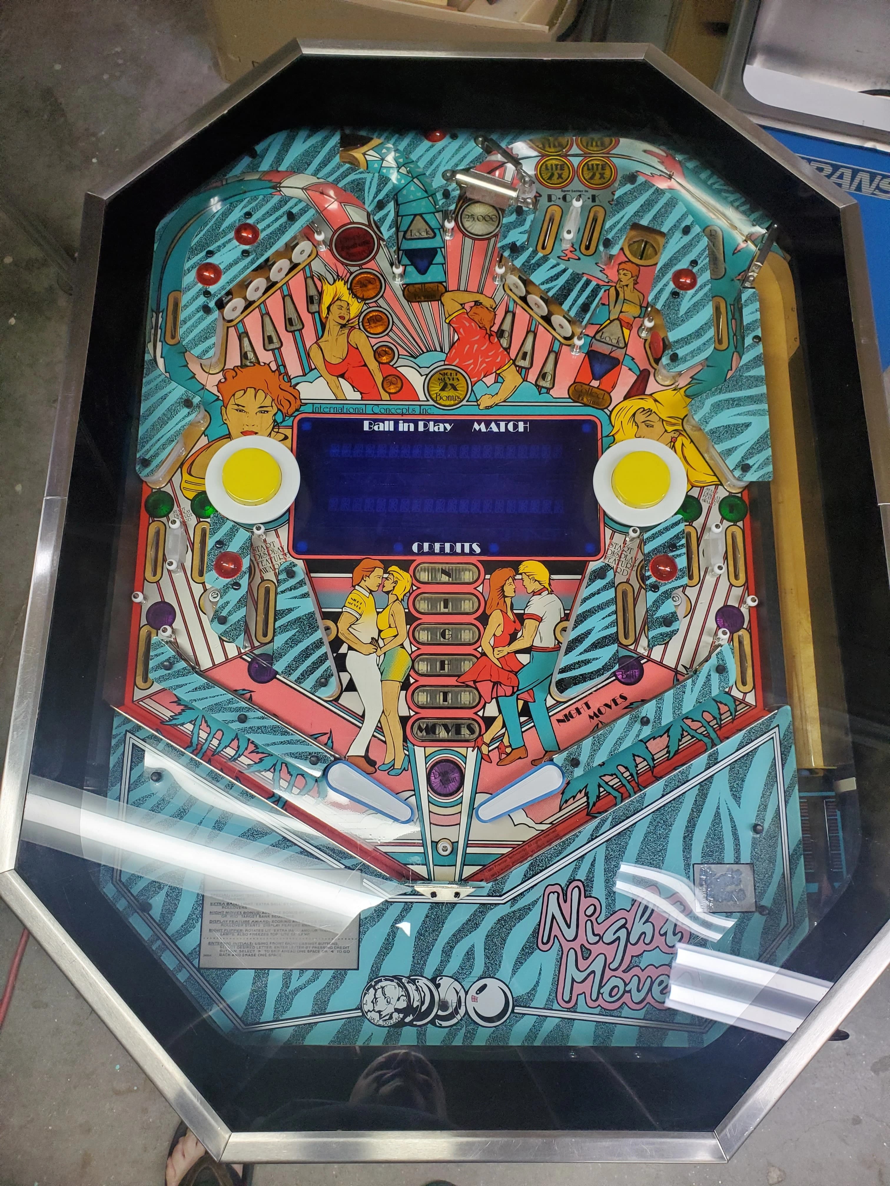 Sign up to share photosNight Moves by International Concepts, released in 1989, is a cocktail-style pinball machine, designed by John Trudeau. It was part of a brief resurgence of cocktail pinball machines in the late '80s. Manufactured by Premier/Gottlieb but sold under the International Concepts brand, the machine features System 80B boards with under-playfield parts typical of Gottlieb designs.