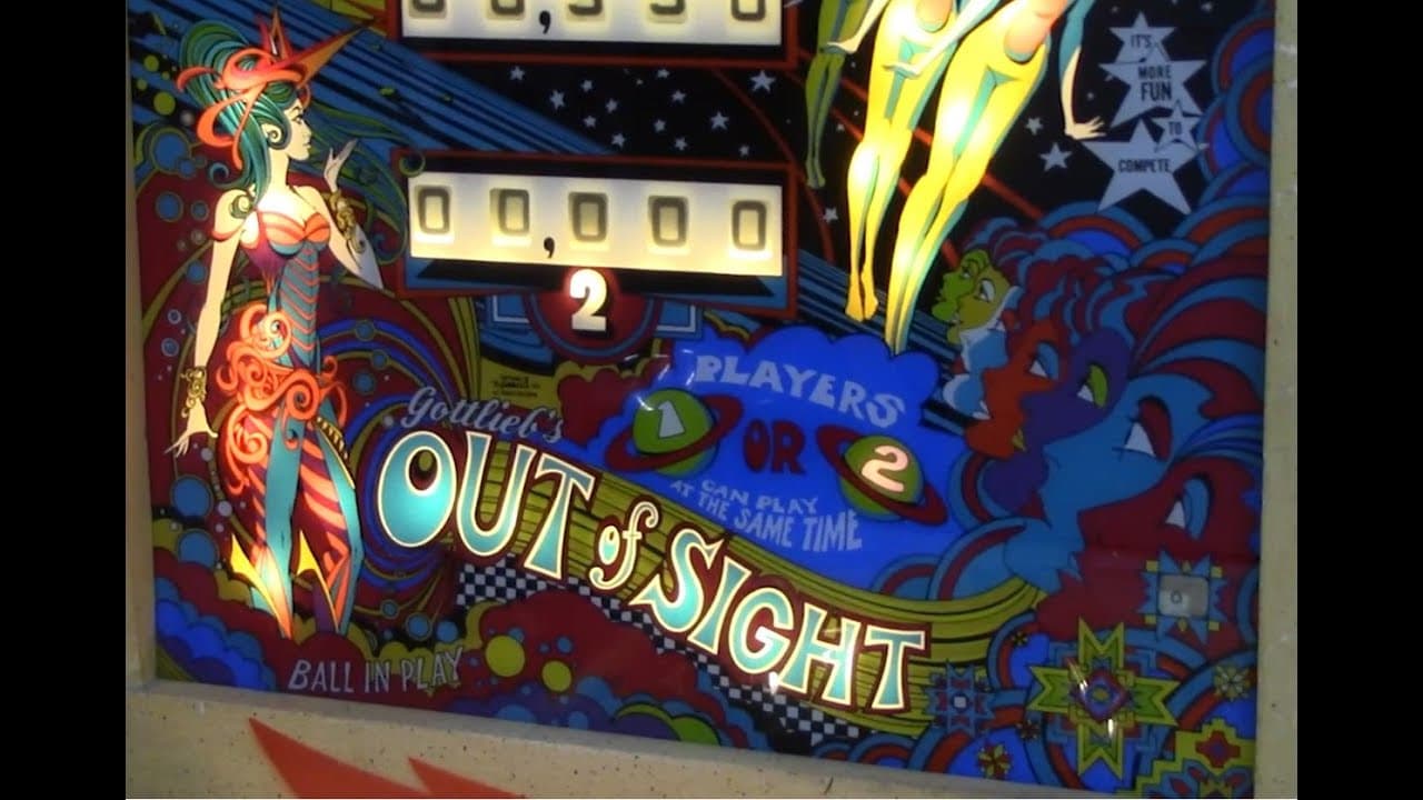 "Out of Sight," released by Gottlieb in December 1974, is a two-player electro-mechanical pinball machine designed by Ed Krynski with artwork by Gordon Morison. This psychedelic-themed game features two flippers, three pop bumpers, two slingshots, and two banks of five drop targets each.