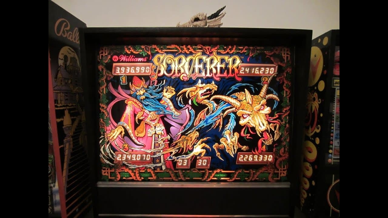 The "Sorcerer" pinball machine, released by Williams in 1985, is a fantasy-themed game designed by Mark Ritchie with striking artwork by Pam Erickson. Known for its captivating light show and multiball play, it features three flippers, three pop bumpers, two spinners, and a 3-bank drop target. The game's distinctive "Second Chance" post and the flashing eyes of the sorcerer on the back panel add to its unique appeal.