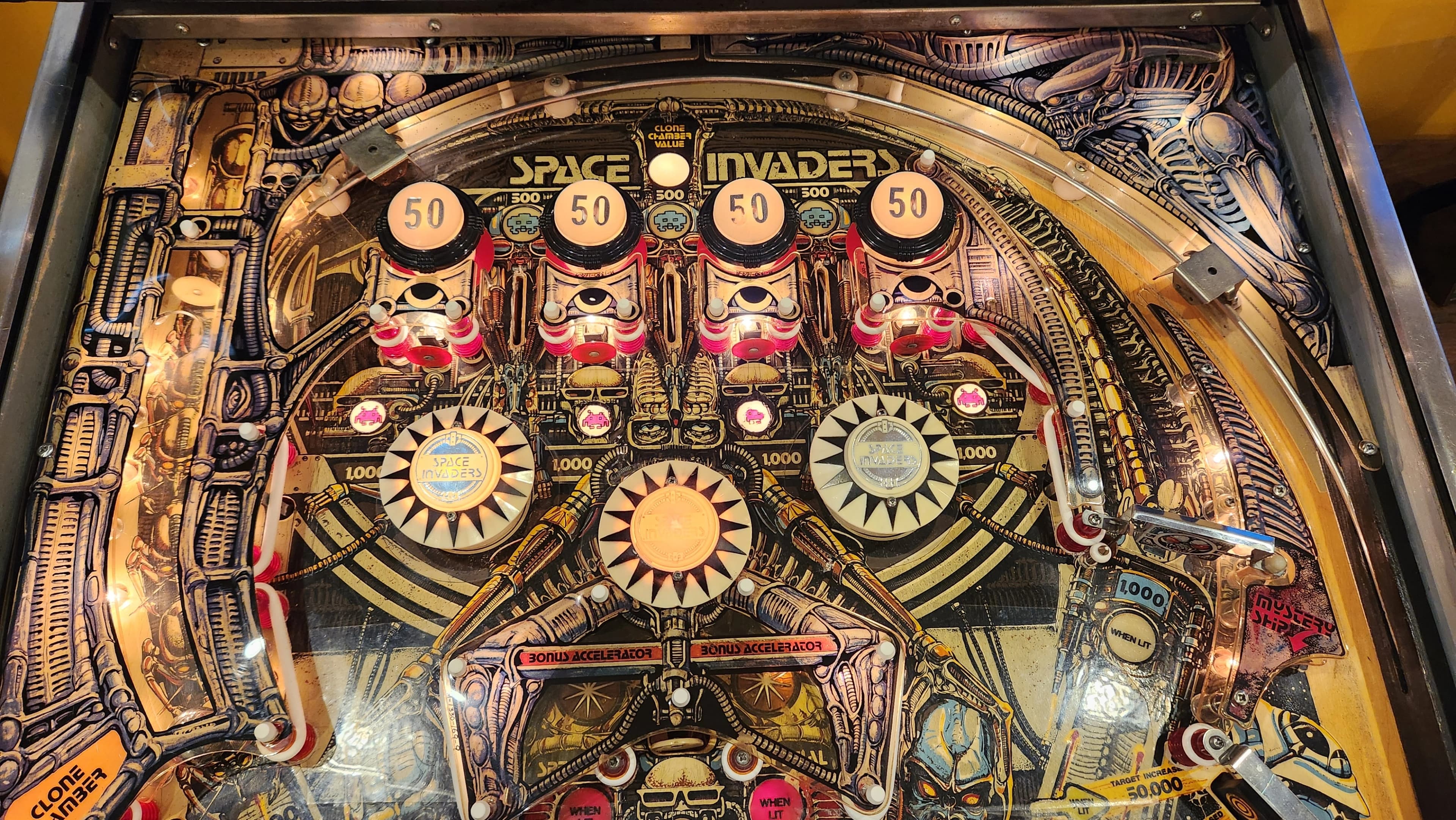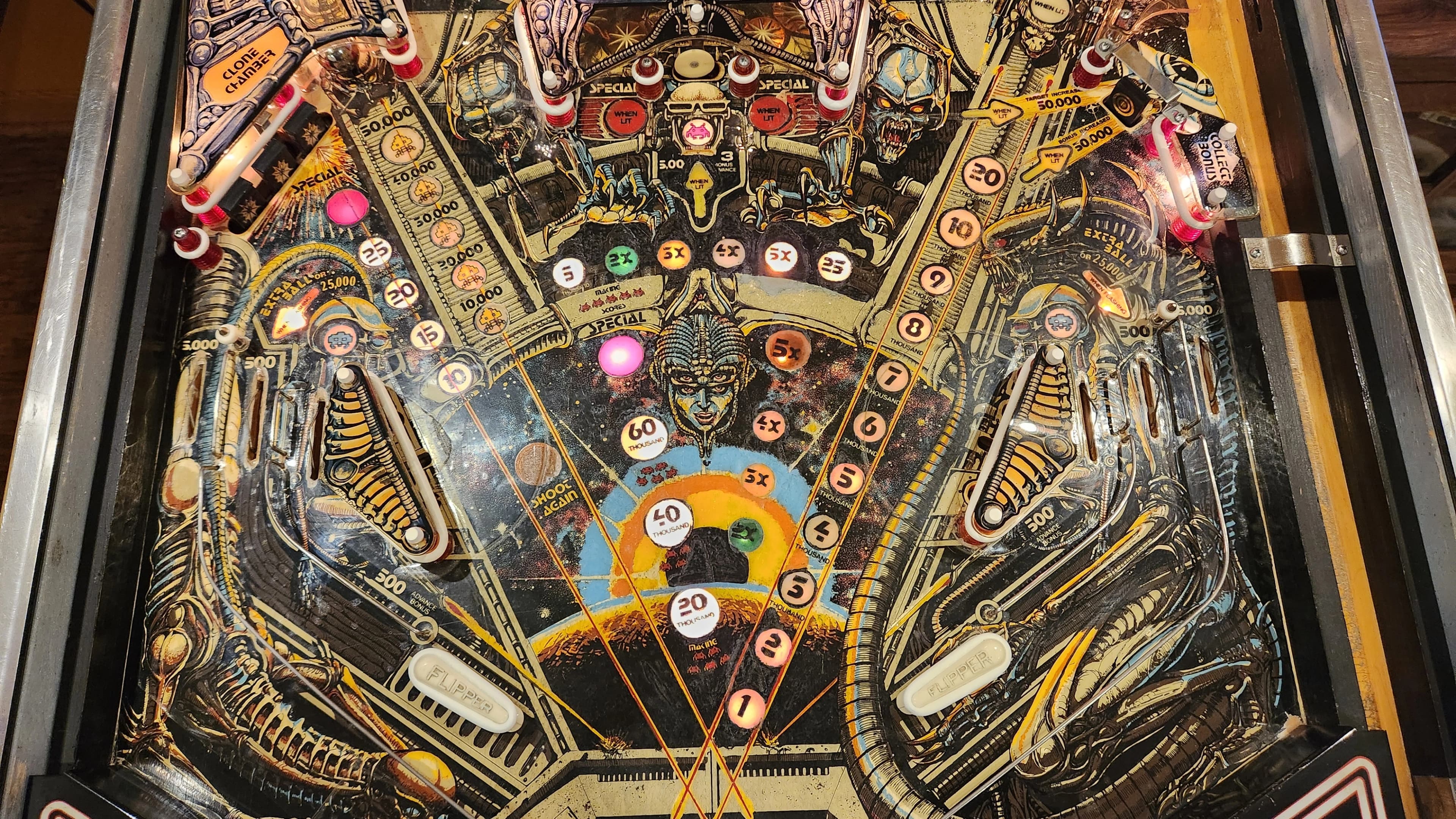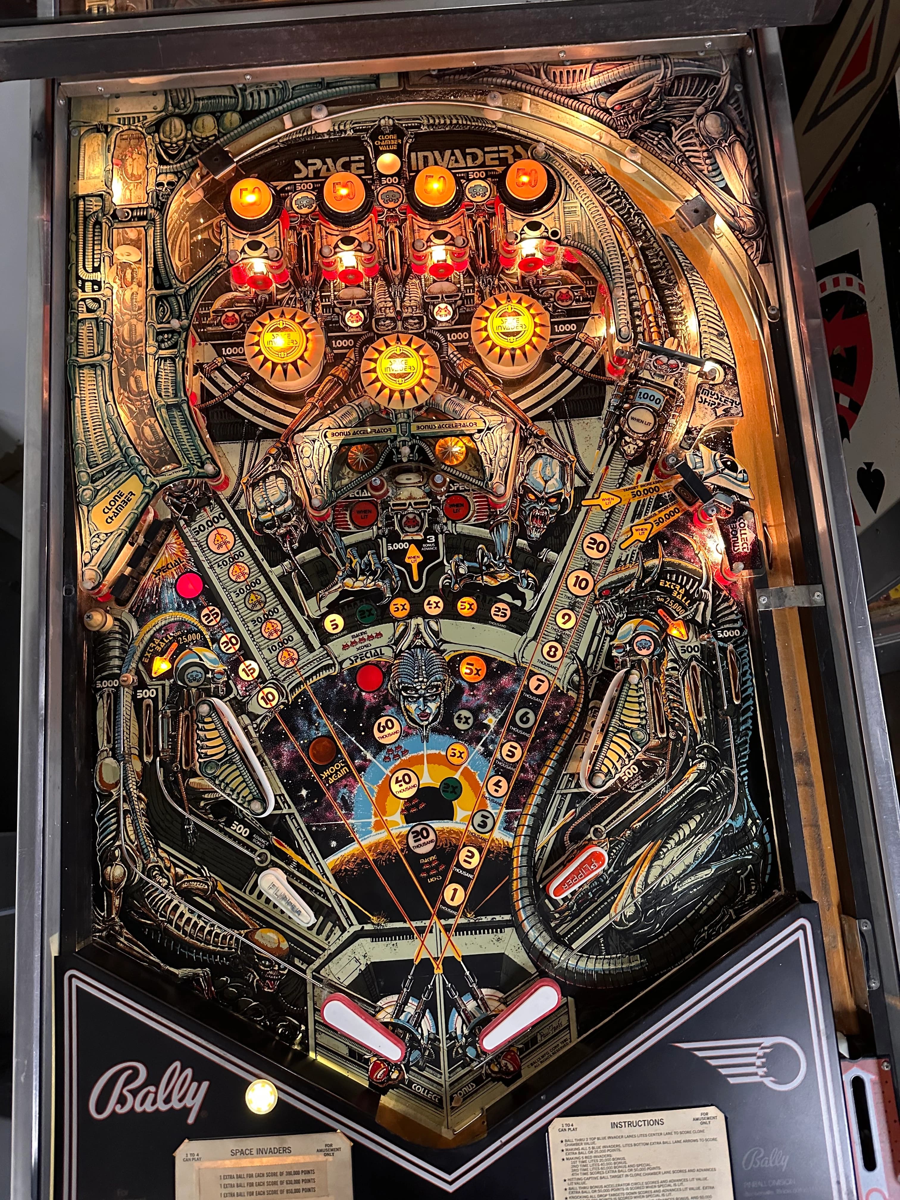 Yes, a pinball machine based on a video game. It was 1980, video games and Space Invaders in particular were the Big New Thing, so it was inevitable. While the machine does have the “bump-bump-bump” sound effects of the video game programmed in, the backglass art owes more to the movie Alien than to the video game. This game is mostly about bonus, although a long enough ball will net you tons of points with spinner shots and various targets around the game. Space Invaders has two separate bonuses to build up. The normal bonus is advanced by lanes, targets and the horseshoe shot, and goes up to 39K. If you get it to 20K or more, the 20K portion is held to future balls, if any. The horseshoe shot is used to advance the bonus multiplier, up to 5X. Total normal maximum bonus is therefore 195K. The upper miniflippers have a better angle on the horseshoe shot, but they’re a bit harder to be precise with. If you can hit the shot with them, fine, if not, use them for ball control, i.e. to deflect, roll or transfer the ball safely to a lower flipper and shoot with that. Once your bonus is at 5X, the horseshoe shot is still worth making since it’s then worth 25K. Bonus two is built up by completing the five red invaders standup targets, four below the top lanes and one at the game center. Each set earns 20K up to 60K max and is held for future balls. The multiplier applies to this, too, for another potential 300K in bonus. The captive ball scores 10K for the first hit, then goes up 10K per hit, topping out at 50K. Decent points, but a risky shot. Getting all three top lane blue invaders lights the top center lane to score the “Clone Chamber Value,” i.e. the current captive ball award. Getting all five blue invaders [three top lanes plus two upper flipper return lanes] lights EBs in the main flipper return lanes and lights the center standup for 5K and 3 bonus advances. The drop target with a pass-through behind it on the right side halfway up the game is important. When it’s blinking and beeping, it’s worth 50K bonus or for the targets, as indicated. Shots through the gap behind it will roll over a collect bonus switch and then return to the plunger. Your collected bonus is not reset, so this can be very valuable; once your bonus multiplier is maxed, shooting the drop target and then the gap is the highest-scoring strategy.