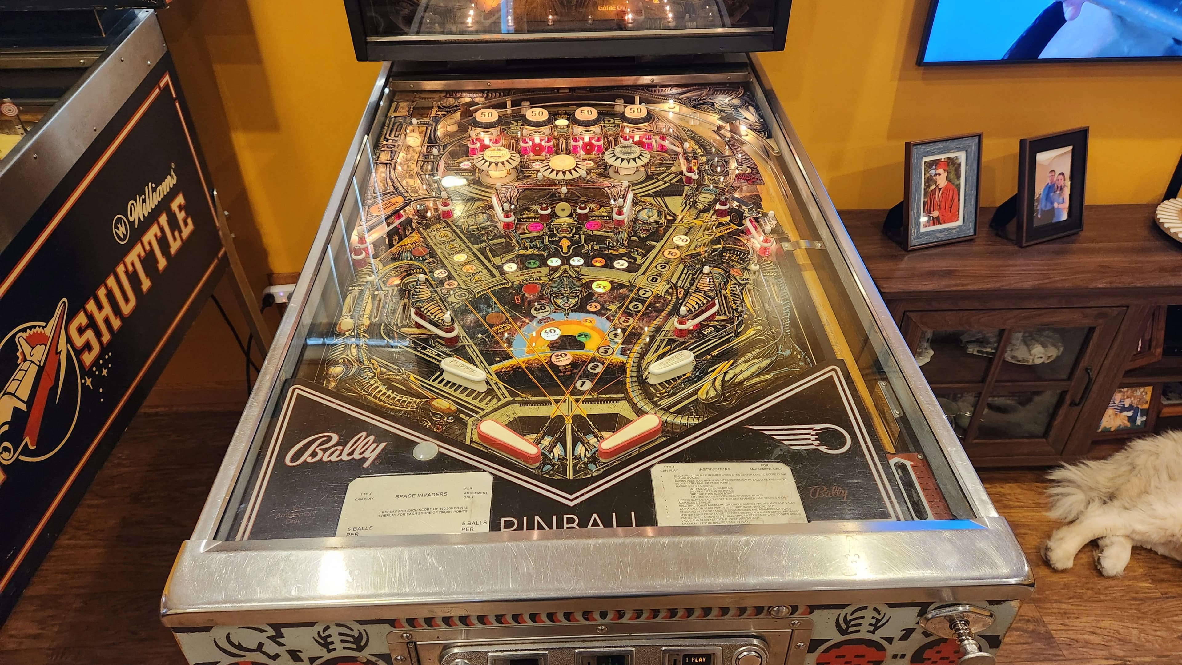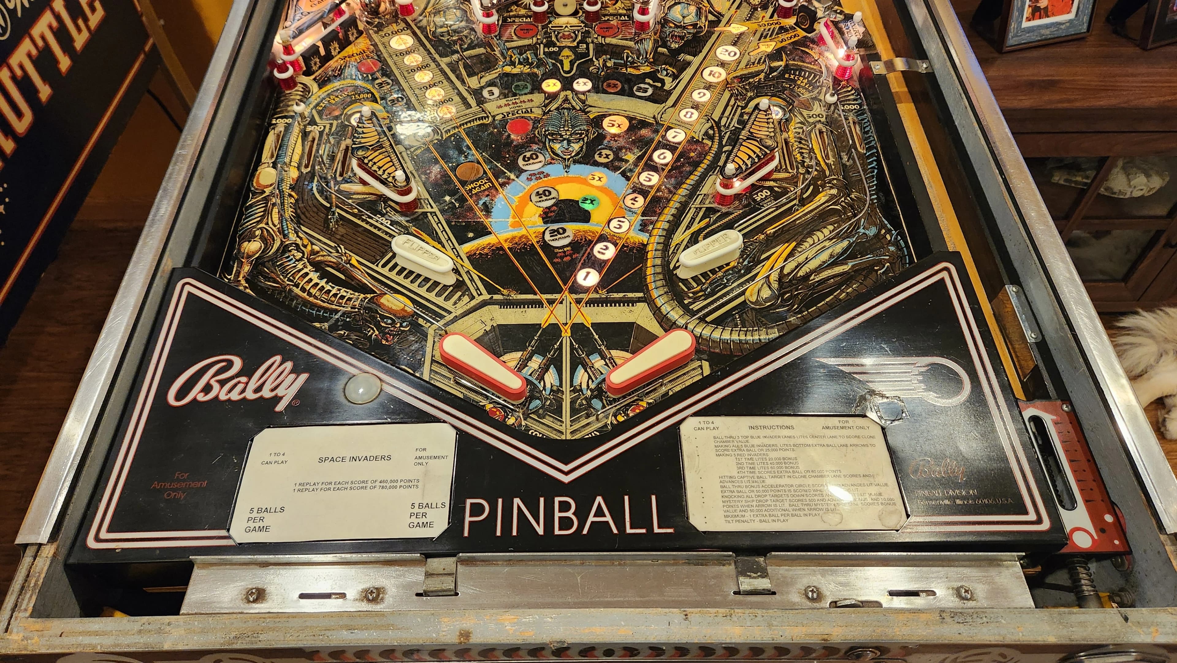 The "Space Invaders" pinball machine, released by Bally in April 1980, is a distinctive widebody game designed by Jim Patla with artwork by Paul Faris. It was the first pinball machine based on a video game, capitalizing on the success of the original 1978 "Space Invaders" arcade game. This machine features striking artwork heavily inspired by the 1979 film "Alien," leading to legal issues due to its resemblance to H. R. Giger's designs.
