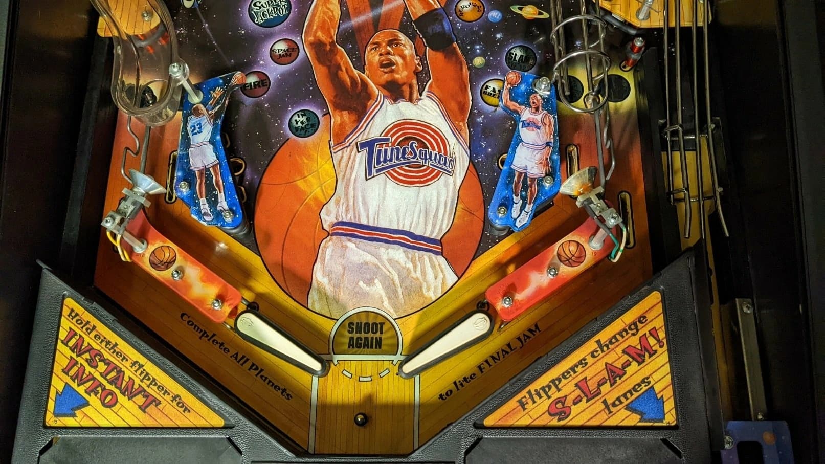 The Space Jam pinball machine, released by Sega Pinball in 1996, is themed around the popular film featuring Michael Jordan and the Looney Tunes characters. Designed by Joe Kaminkow, Lonnie D. Ropp, and Orin Day, the game includes artwork by Morgan Weistling and music by Brian Schmidt.