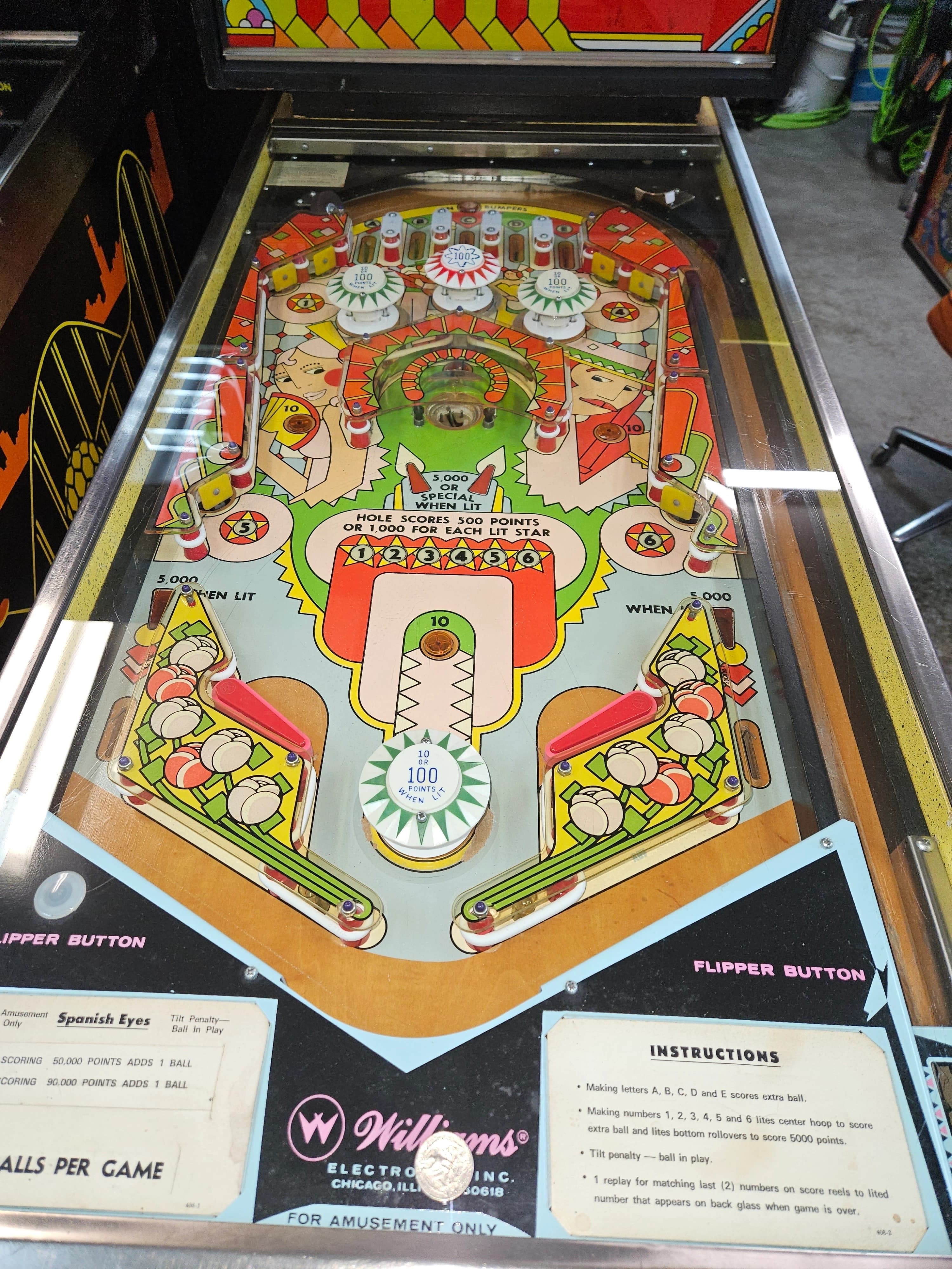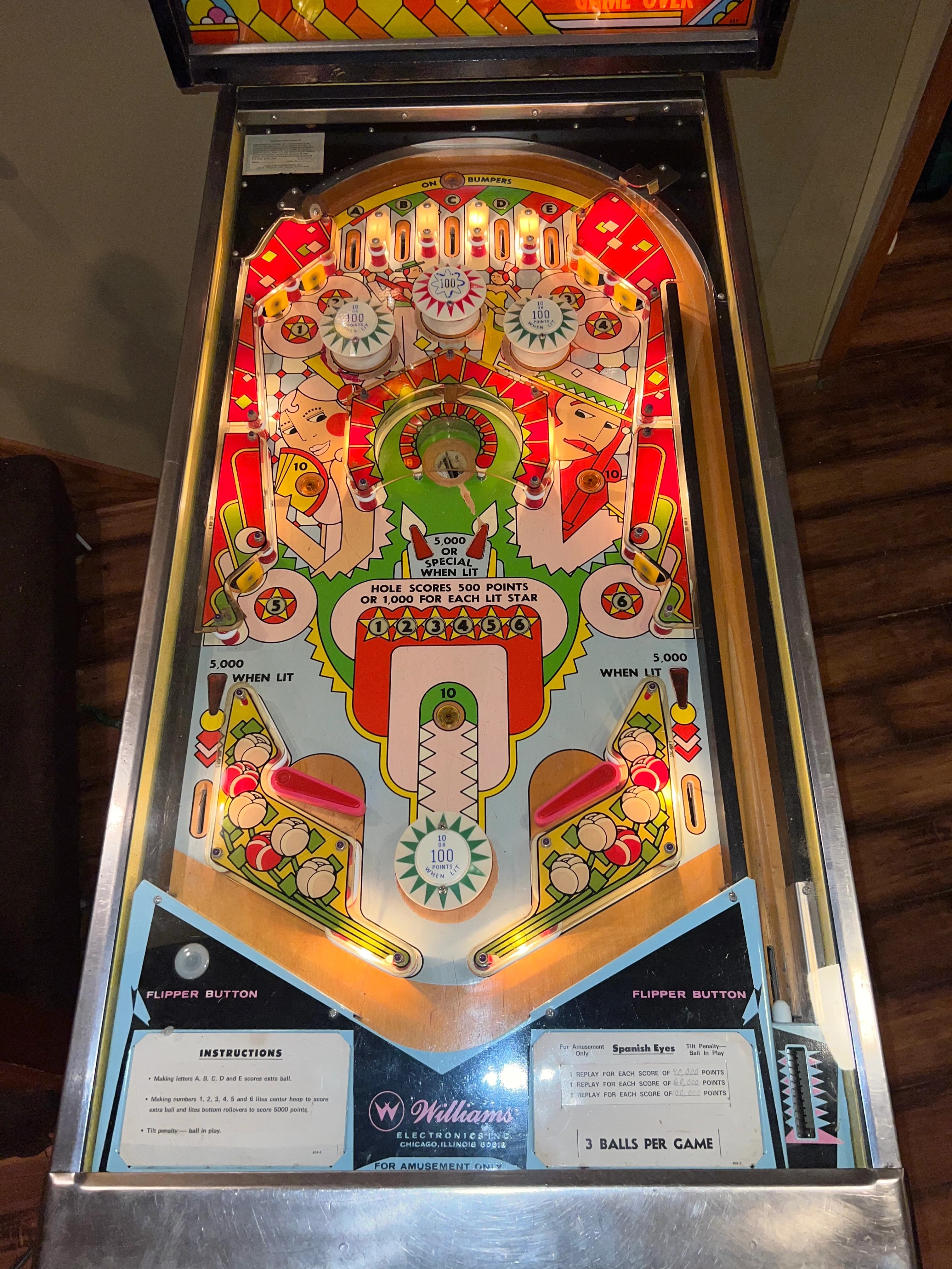 The "Spanish Eyes" pinball machine, produced by Williams in 1972, is a single-player electromechanical game designed by Norm Clark and featuring artwork by John Craig. A distinctive feature of this game is the unusual pop bumper positioned between the flippers, which adds a unique challenge for players. The game incorporates DC-powered jet bumpers, offering fast-paced action and engaging gameplay.