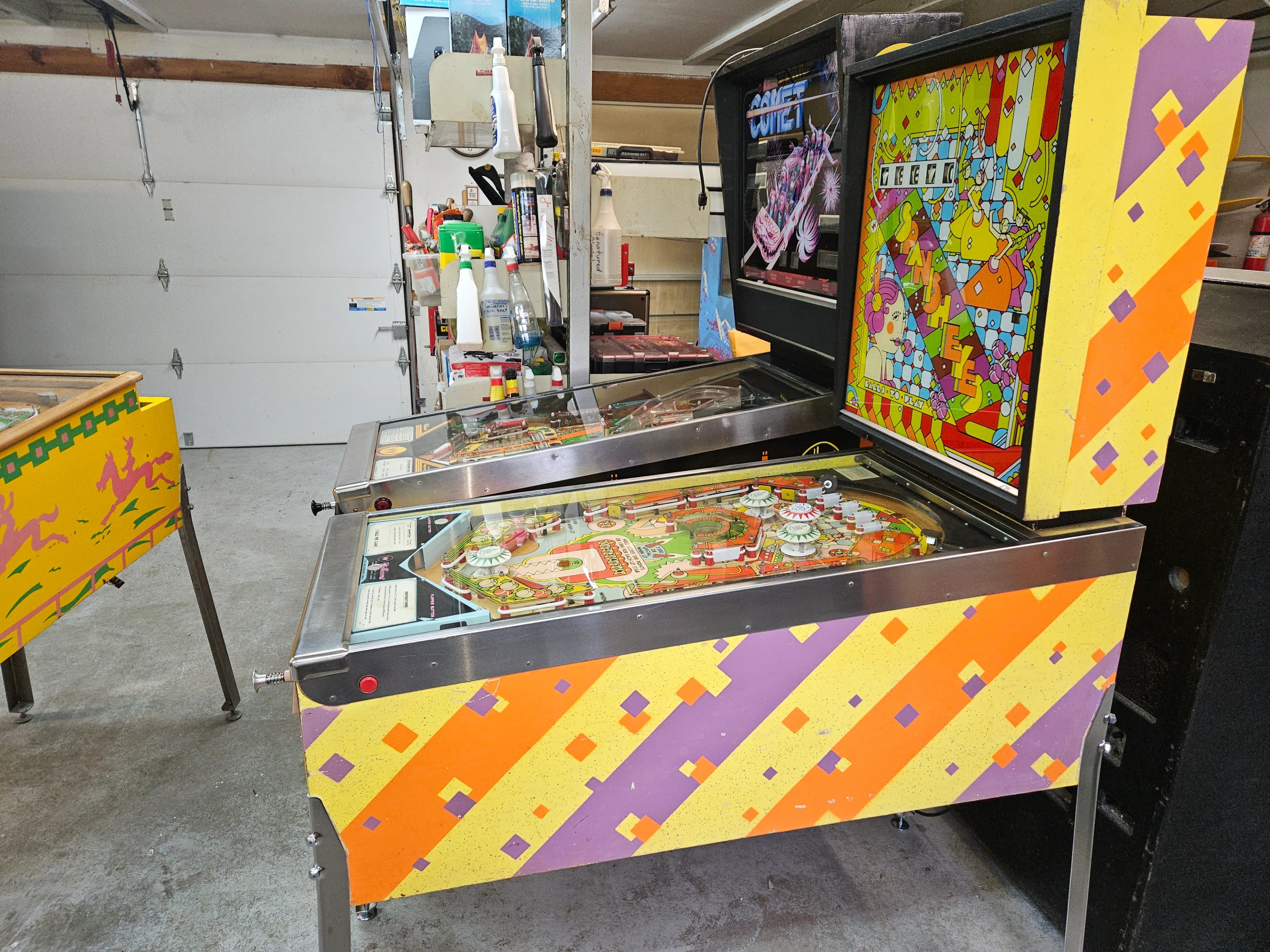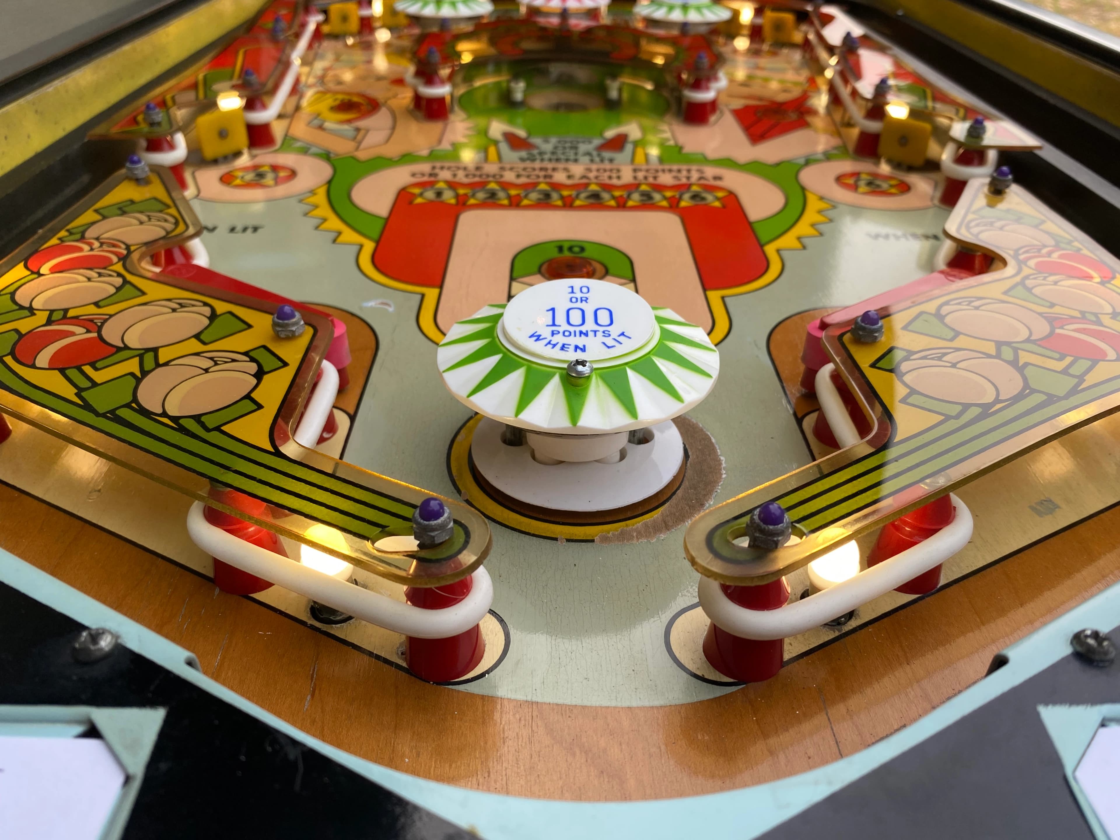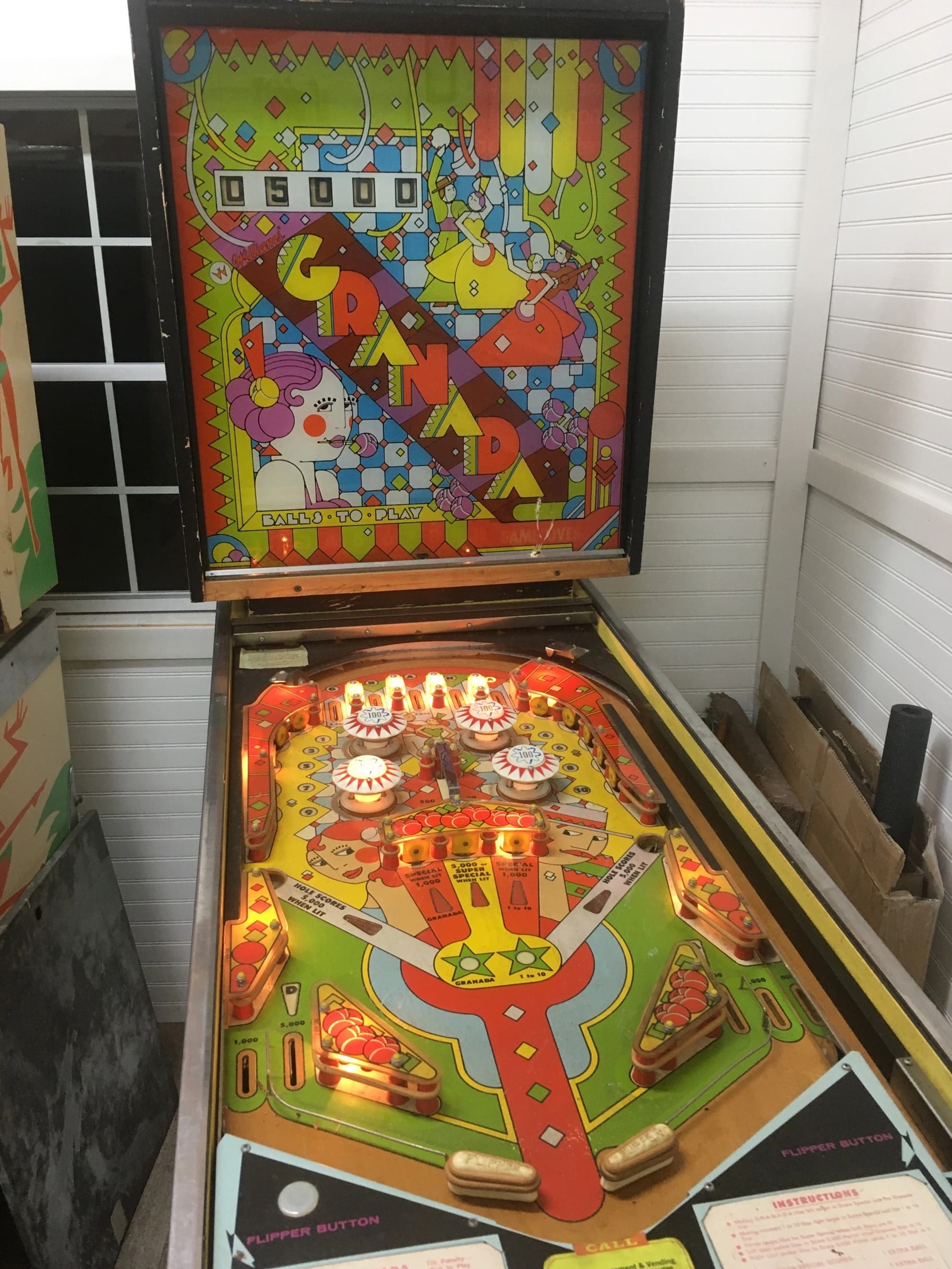 Visually like Spanish Eyes [especially the backglass], but with a noticeably different playfield. Like Spanish Eyes, meant to be played with extra balls ON. And not much fun to play if the bumpers are weak. There are two ways to earn EBs on the game: one via the G-R-A-N-A-D-A letter lanes, the other via the numbered 1-10 standup targets. Finish either and then hit the corresponding special target in the center to get your extra ball. If you’ve finished both, hit the center special for two extra balls. Bumper strength is important since most of the numbers and letters on the game cannot be shot directly from either flipper. Most must be bounced into by the bumpers. If the bumpers are strong, shots up top will get you a couple of the numbers and maybe an up-the-top-lane letter or two. If they’re weak … you’ll wish you weren’t playing the game. Like Spanish Eyes, you get a 5000 point feature lit when you complete things, in this case, the left saucer for the letters and the right saucer for the numbers. Otherwise, most of your points come from bumper action up top - - the bumpers themselves, each target or lane you score, and the 500-point gate between the lower pair of bumpers. The two return lanes score 5000 each, big on this game, so since the return lanes are shatzable, learn to do it. In fact, if the bumpers are so-so and the shatz shot exit from the return lanes is safe, consider a shatz-all-day strategy - - boring but effective. Historical Note: this is the game where I first took up shooting the ball up the opposite return lane, what is now commonly referred to as “shatzing.” I think Neil Shatz was about 5 years old at the time.