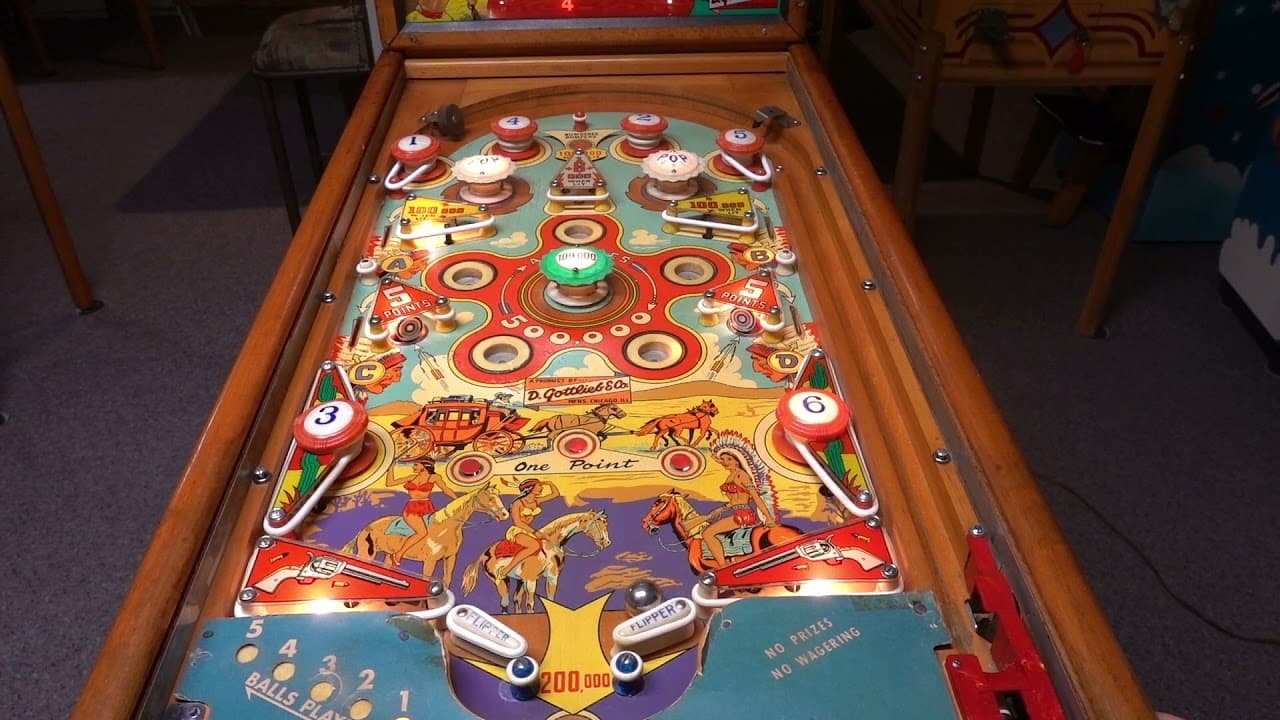 The "Stage Coach" pinball machine, released by D. Gottlieb & Co. in November 1954, is a single-player, electro-mechanical game designed by Wayne Neyens, with artwork by Roy Parker.