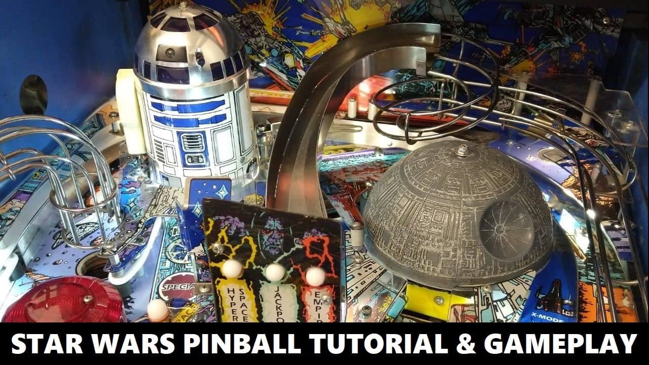 Distinctive physical elements include a rotating silver globe representing the Death Star, and a playful R2-D2 figure above the pop bumpers that moves up and down. The game also includes licensed voice and music cues from the films, along with a video mode and a dot-matrix display