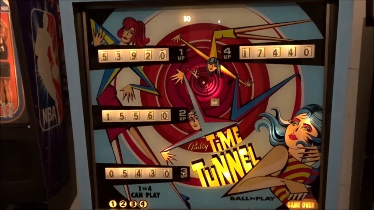 The Time Tunnel pinball machine, developed by Bally in 1971, was an ambitious electro-mechanical game designed by Jim Patla with art by Christian Marche. However, the machine never saw full production due to a copyright conflict with the "Time Tunnel" TV show. Only 70 units were produced before it was rebranded and redesigned as Space Time and later Time Zone.