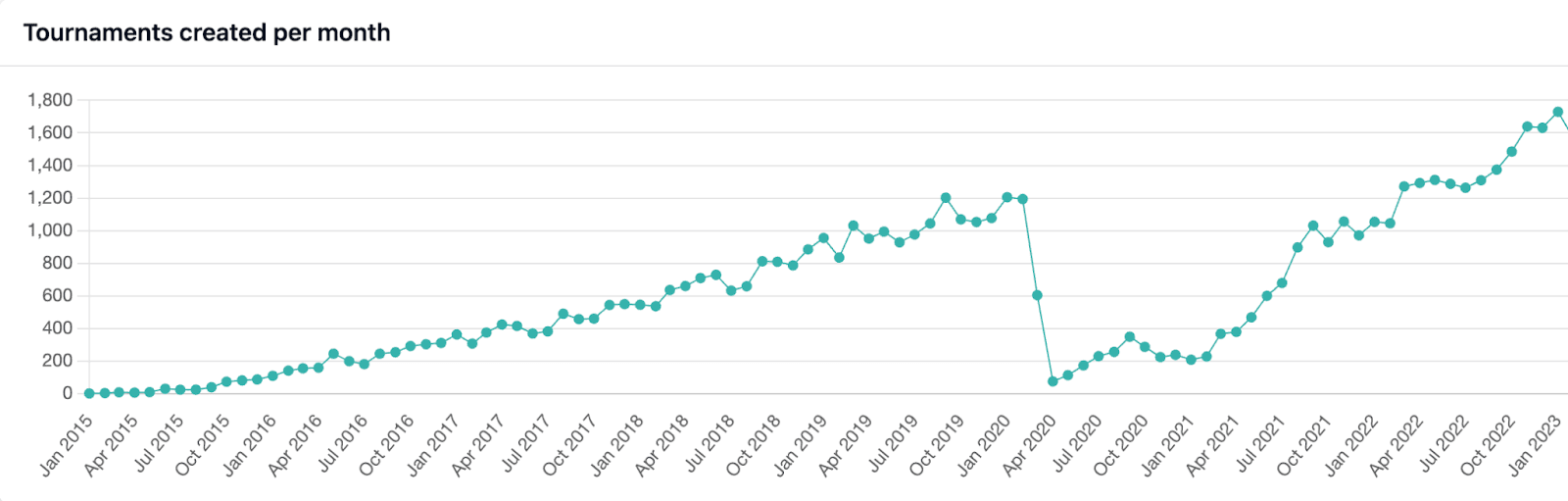 Andreas: The number of tournaments still increases almost every month, so annual numbers are not super useful. There are over 1,500 tournaments each month. There are results from over 3.7 million games of competitive pinball in the database.