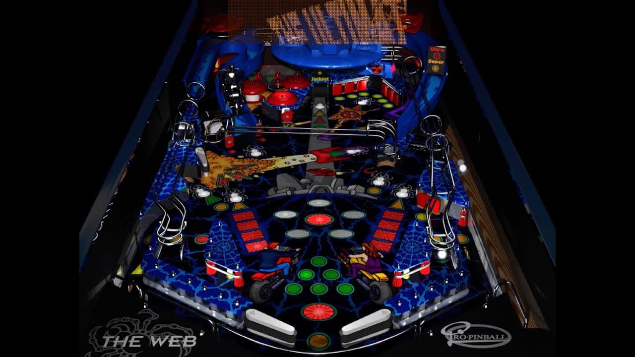 The Webwas the first Pro Pinball release, in 1995, and was roughly based on the STTNG demo described above. The playfield resembles a mirrored version of that game’s layout, and the overall focus on missions started at the center sinkhole, combined with the multiball structure, take inspiration from that game. Steve Ritchie’s other tables are a common source of inspiration as well; two banks of drop targets like the ones on Black Knight 2000gate the reactor shot, and the table features a magnet at the upper flipper that behaves akin to the one on Rollergames.