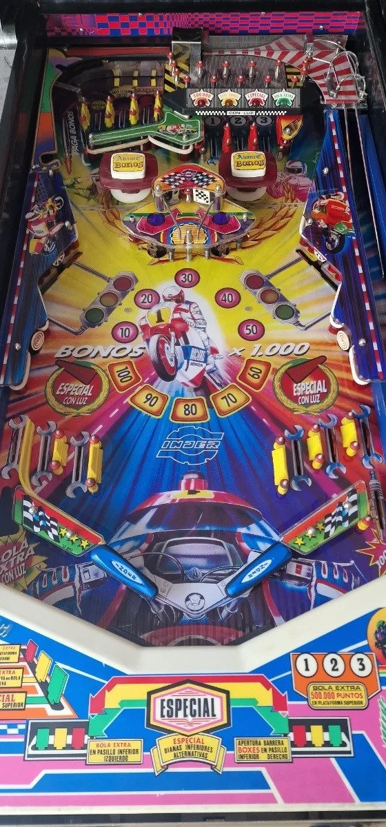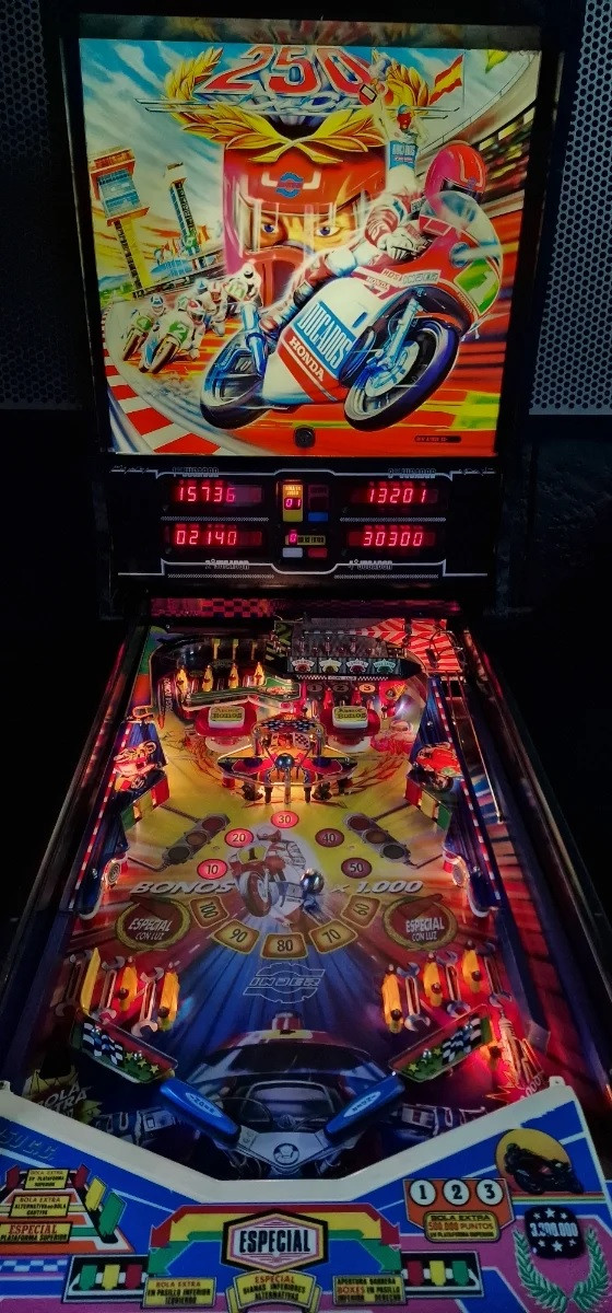 "250 cc" is a motorcycle racing-themed pinball machine released by the Spanish manufacturer Inder in 1992. The game accommodates up to four players and features two flippers, two pop bumpers, six standup targets, two banks of three drop targets, a captive ball, and an elevated mini-playfield.
