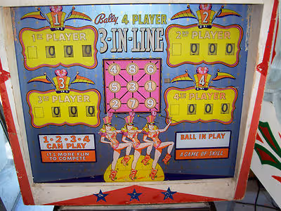 "3-In-Line," released in July 1963, is a four-player, electro-mechanical game featuring two flippers, three pop bumpers, two slingshots, five standup targets, and two rollunder lanes.