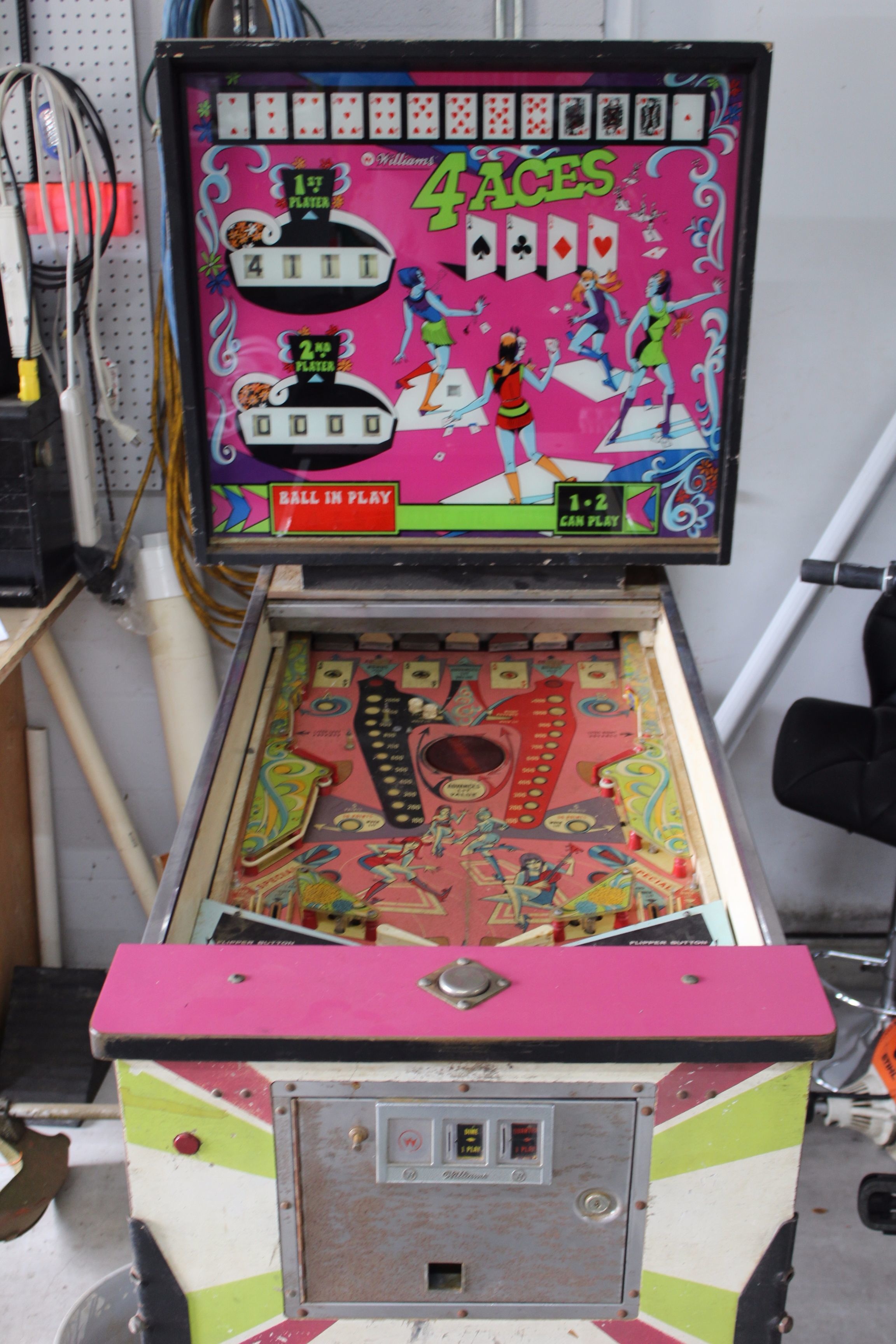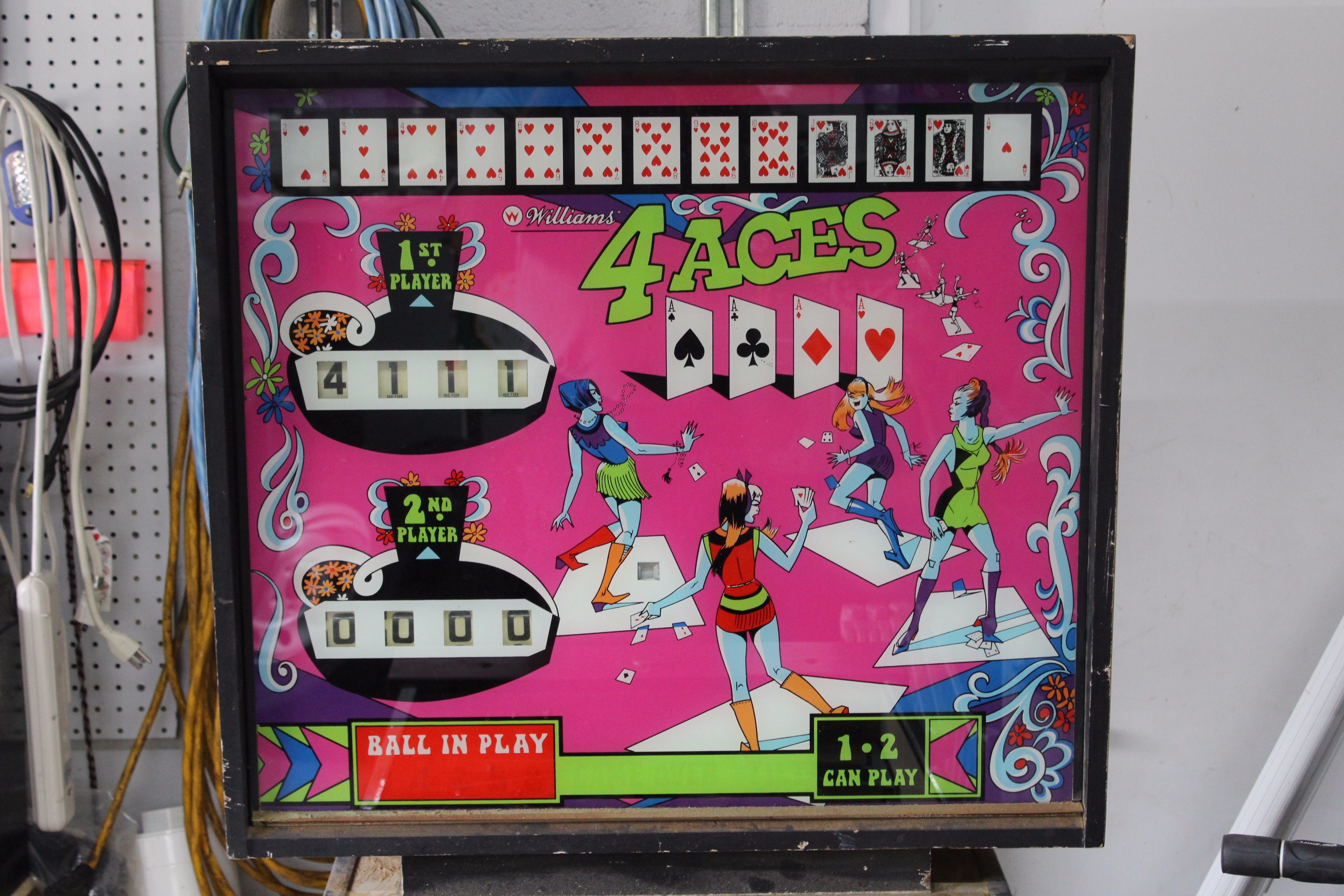 The 4 Aces pinball machine, released by Williams Electronic Games Inc. in March 1970, was designed by Steve Kordek with artwork by Louis Raynaud. This electro-mechanical game features a widebody cabinet and supports two players. It includes four flippers, seven hanging targets, and stop magnets that create unique gameplay dynamics.