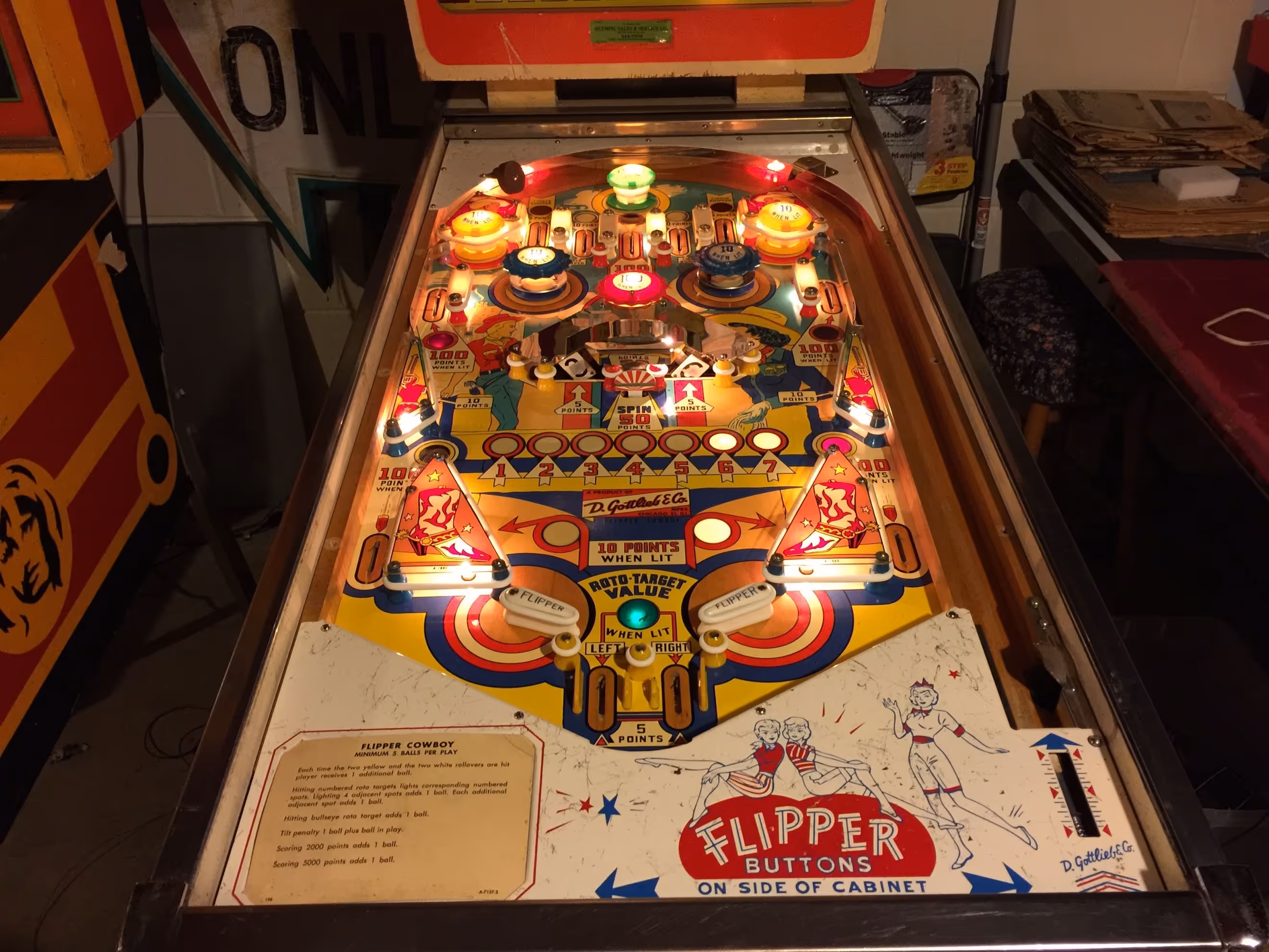 Flipper Cowboy, produced by D. Gottlieb & Co. in 1962, is an electro-mechanical pinball machine themed around the American West. Designed by Wayne Neyens with artwork by Roy Parker, this single-player machine features two flippers, three pop bumpers, and an animated backbox where a cowboy character "shoots" at targets.