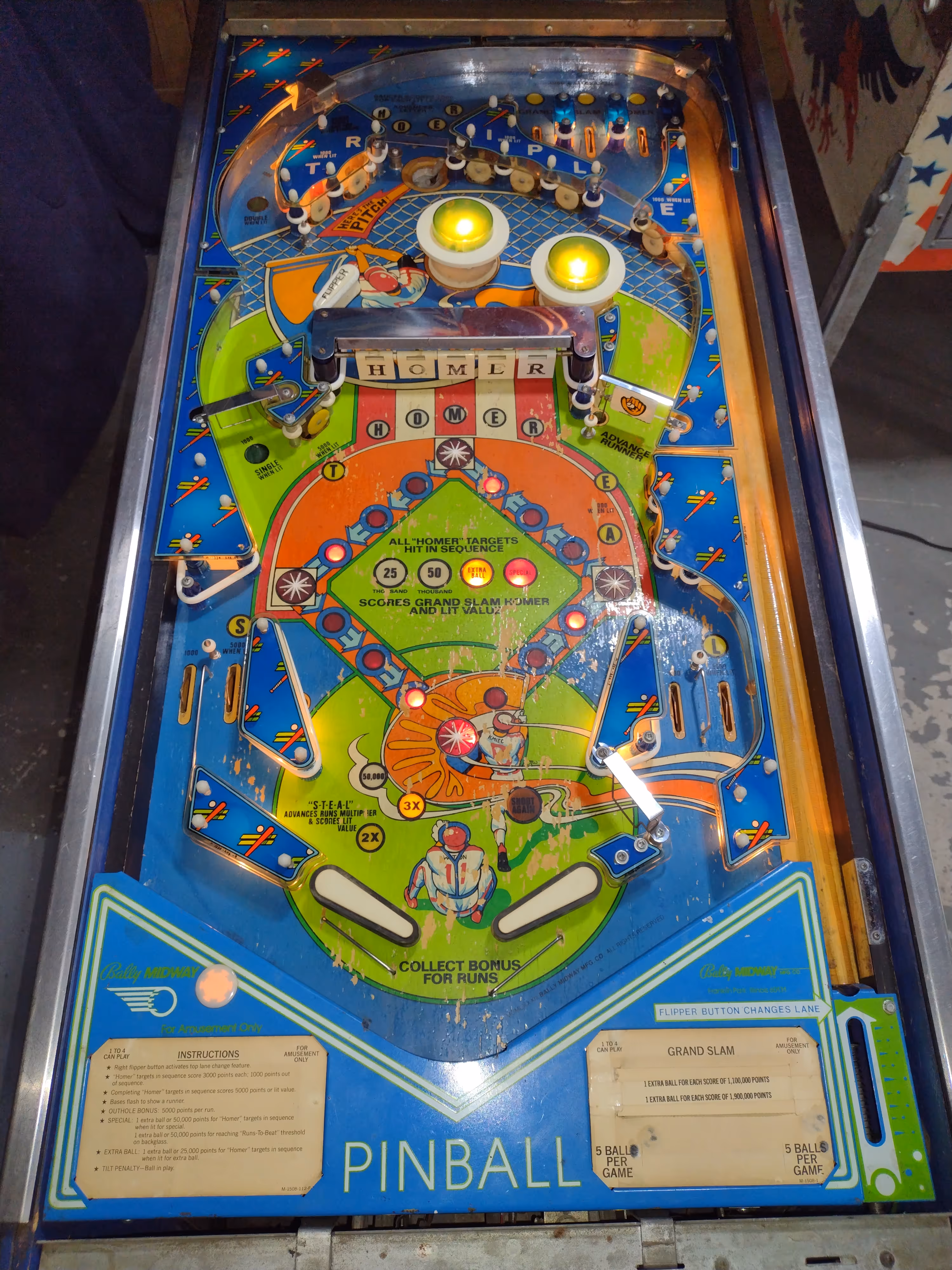"Grand Slam" is a pinball machine released by Bally in 1983, designed as an economical, straightforward game with a baseball theme. It features three flippers, no ramps, and no multiball, emphasizing a simpler playstyle typical of the era.