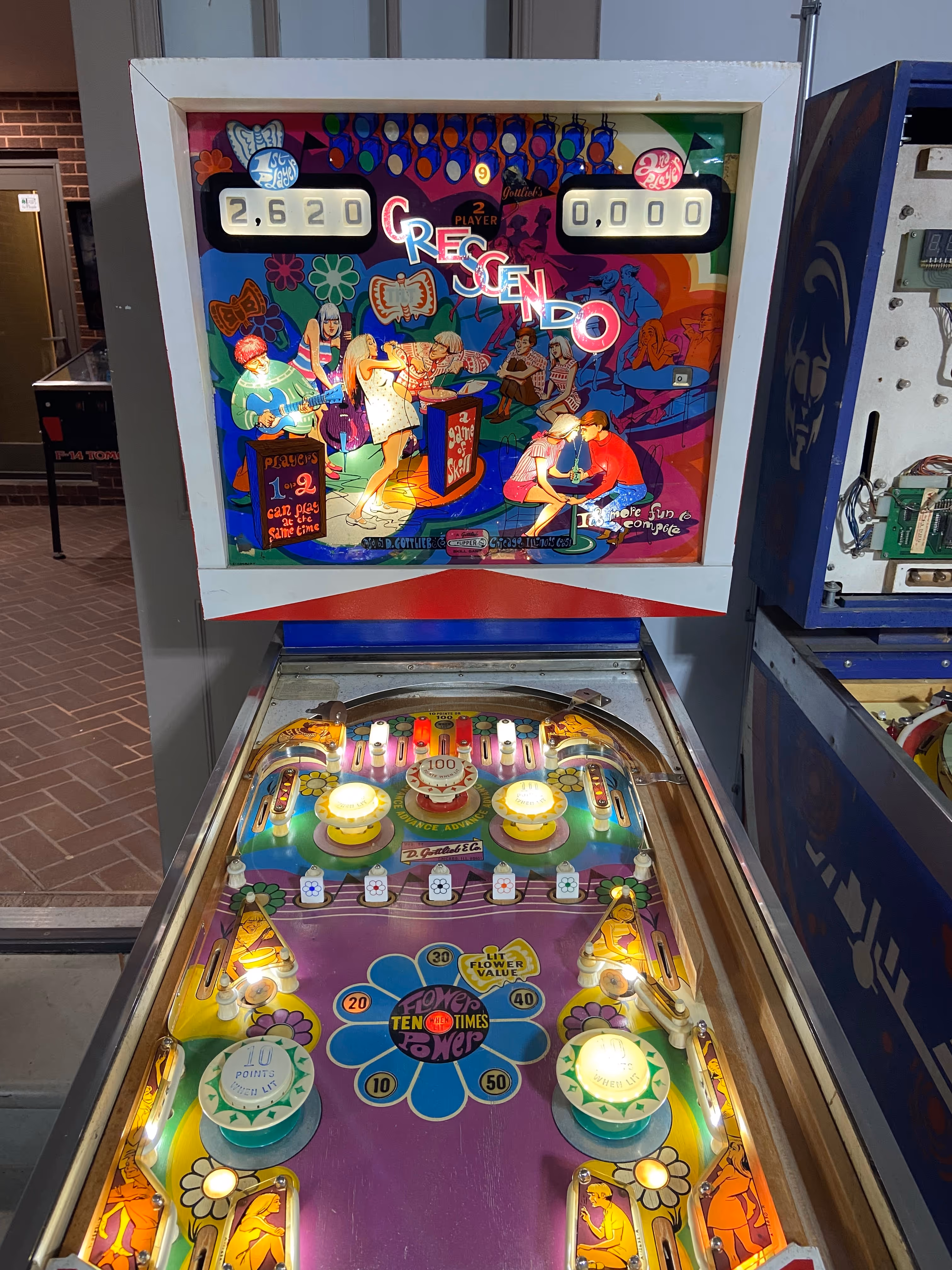 The Groovy and Crescendo pinball machines, both released by D. Gottlieb & Co. in 1970, are nearly identical in design but differ in player capacity—Groovy supports four players, while Crescendo is a two-player version. Designed by Ed Krynski with artwork by Art Stenholm, both machines feature vibrant artwork reflecting the era's psychedelic aesthetic. Notably, these games were the first from Gottlieb to feature modern-style drop targets, a significant innovation at the time.