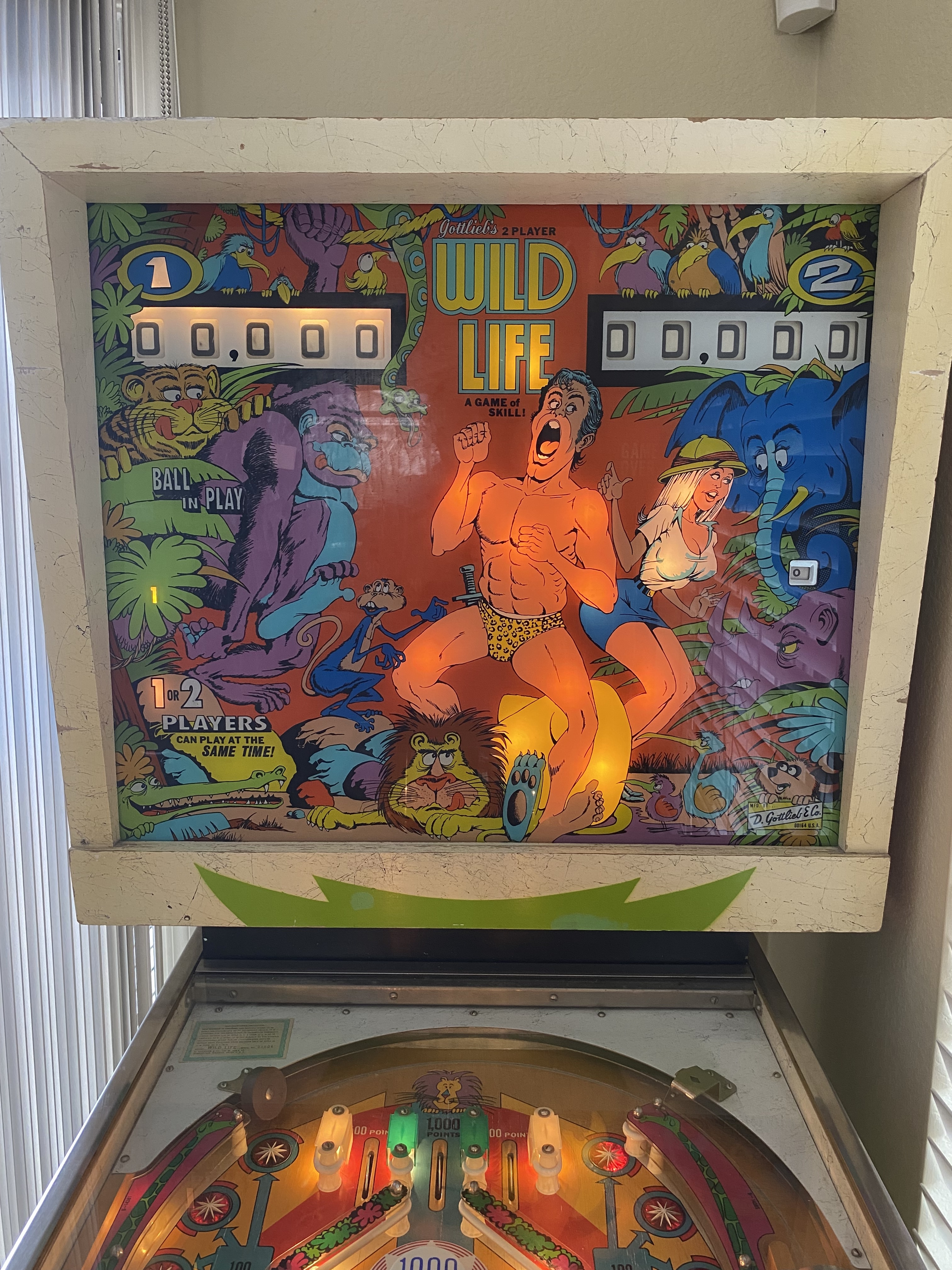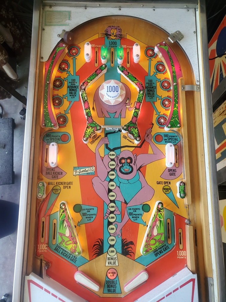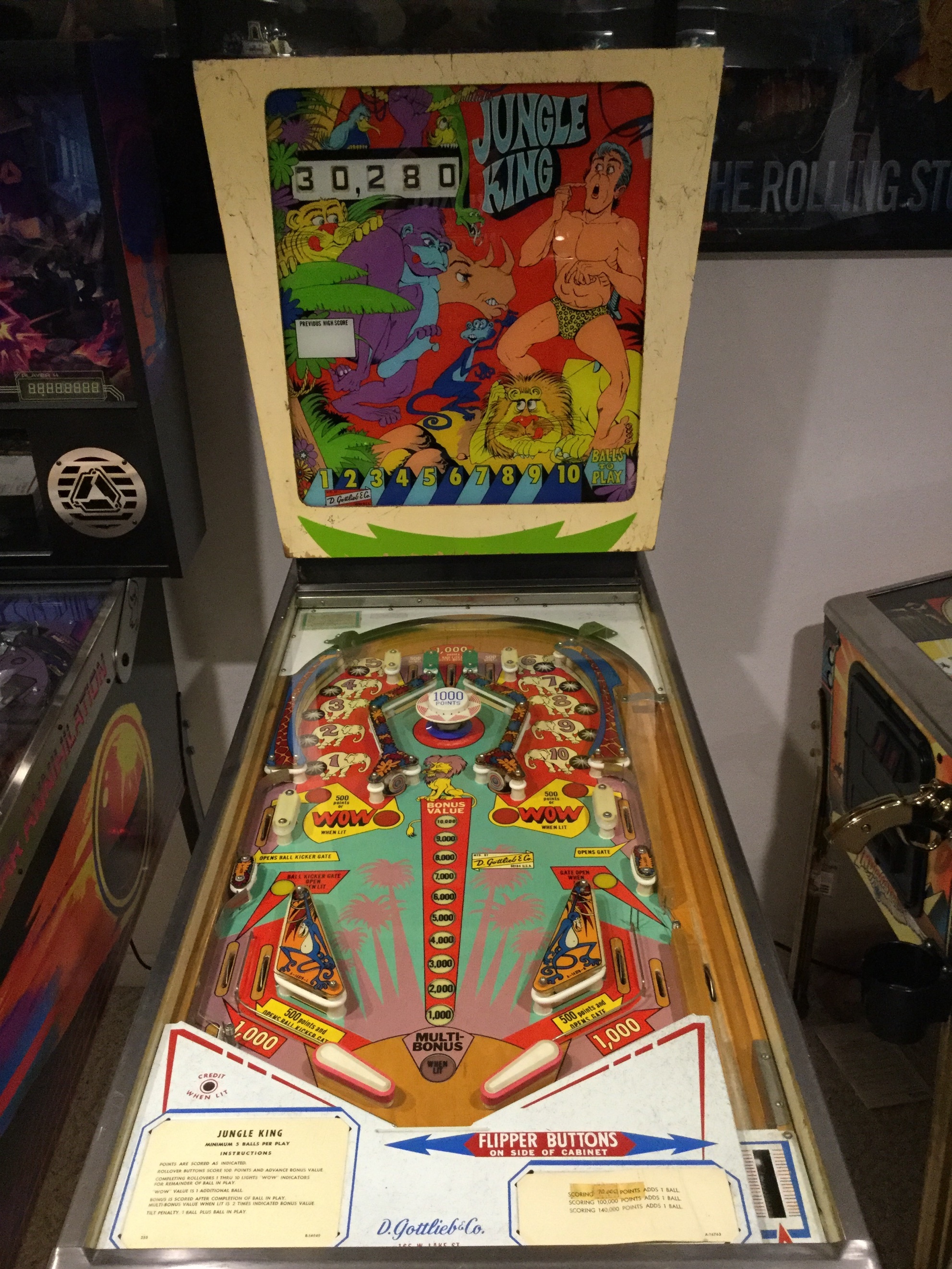 Jungle, Wild Life, and Jungle King are pinball machines produced by D. Gottlieb & Co. in the early 1970s, all designed by Ed Krynski with artwork by Gordon Morison. These machines share a jungle theme and feature similar gameplay mechanics, including rollovers that advance the bonus, a kickback in the left outlane, and a gate at the right outlane. The main differences lie in their player capacities and bonus rules: Jungle is a four-player game produced in 1972 with a focus on doubling bonuses on the last ball; Wild Life is a two-player version with similar rules; and Jungle King is a single-player "add-a-ball" version released in 1973, allowing for bonus doubling on every ball under specific conditions.