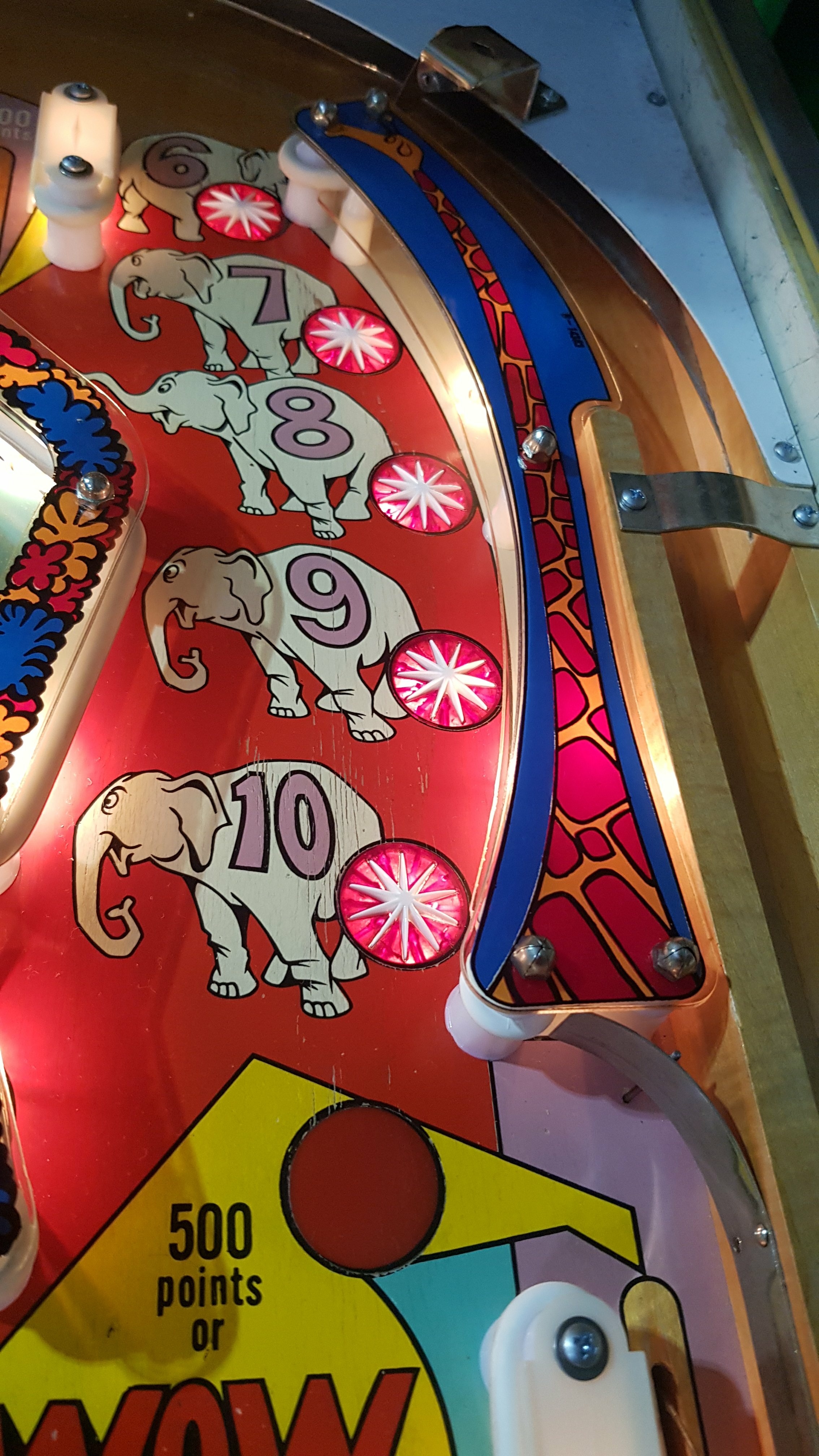 This game is about the rollovers, 5 in an arc along each side of the game. They advance your bonus. Once the bonus is maxed out at 10000, the rollovers are worth 1000 each. Going through the left side lane or left return lane turns on the kickback in the left outlane; going through the ride side lane or right return lane opens the gate at the right outlane. The top center lane lights double bonus; this is your Skill Shot. Unlike its near-twins Jungle and Wild Life, you can get double bonus on every ball but never get it automatically.