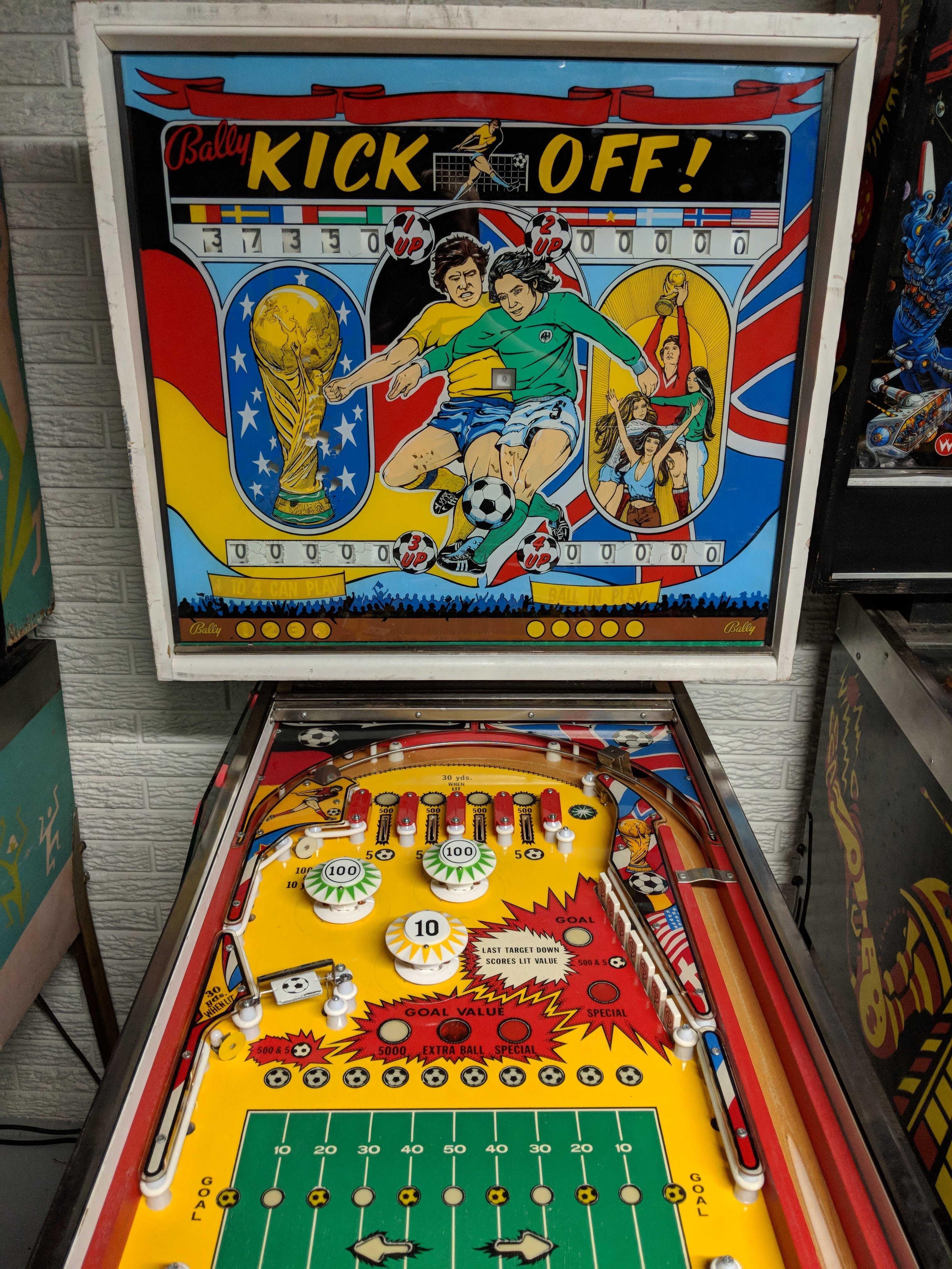 Kick Off (1977) and Quarterback (1976) are two pinball machines produced by Bally Manufacturing, both designed by Jim Patla with artwork by Paul Faris. Kick Off is a soccer-themed, four-player electro-mechanical (EM) machine, featuring four flippers, three pop bumpers, and a bank of seven drop targets. It was Bally's last EM game, making it notable among collectors. Its counterpart, Quarterback, is the two-player version with an American football theme and shares a similar playfield layout.