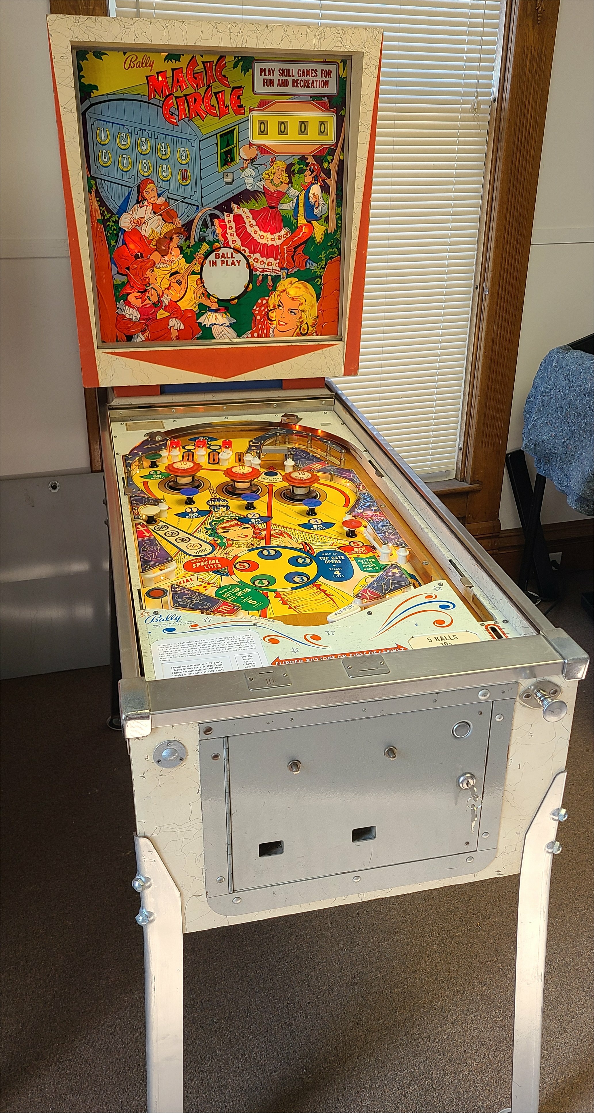 Magic Circle, released by Bally Manufacturing Co. in June 1965, is a single-player electro-mechanical pinball machine with a fortune-telling and dancing theme. Designed by Ted Zale, the game features two flippers, three pop bumpers, six mushroom bumpers, and two slingshots.