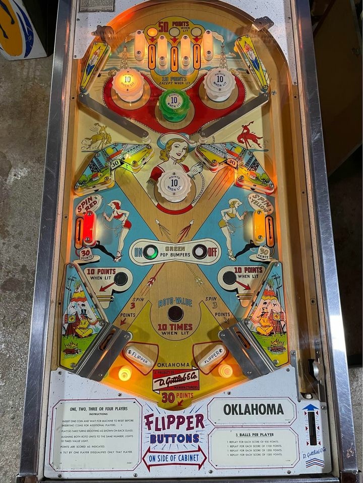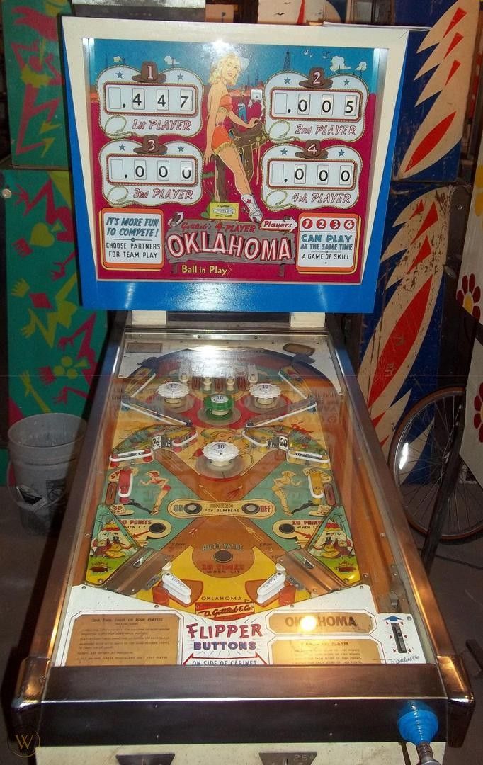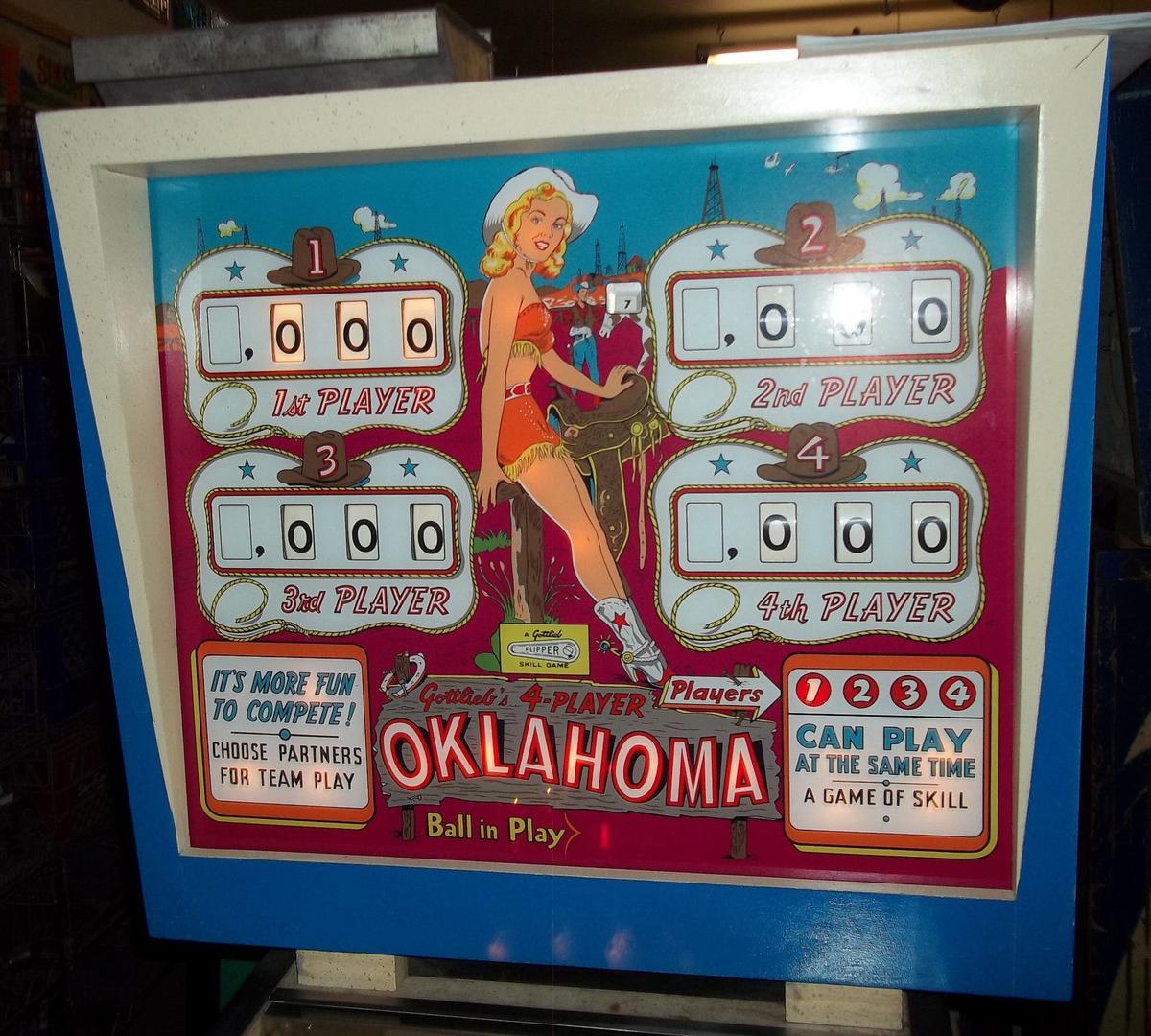 "Oklahoma" is a four-player electro-mechanical pinball machine released by D. Gottlieb & Co. in February 1961. Designed by Wayne Neyens with artwork by Roy Parker, the game features two flippers, four pop bumpers, two slingshots, two ball kickers, and two roto-targets.