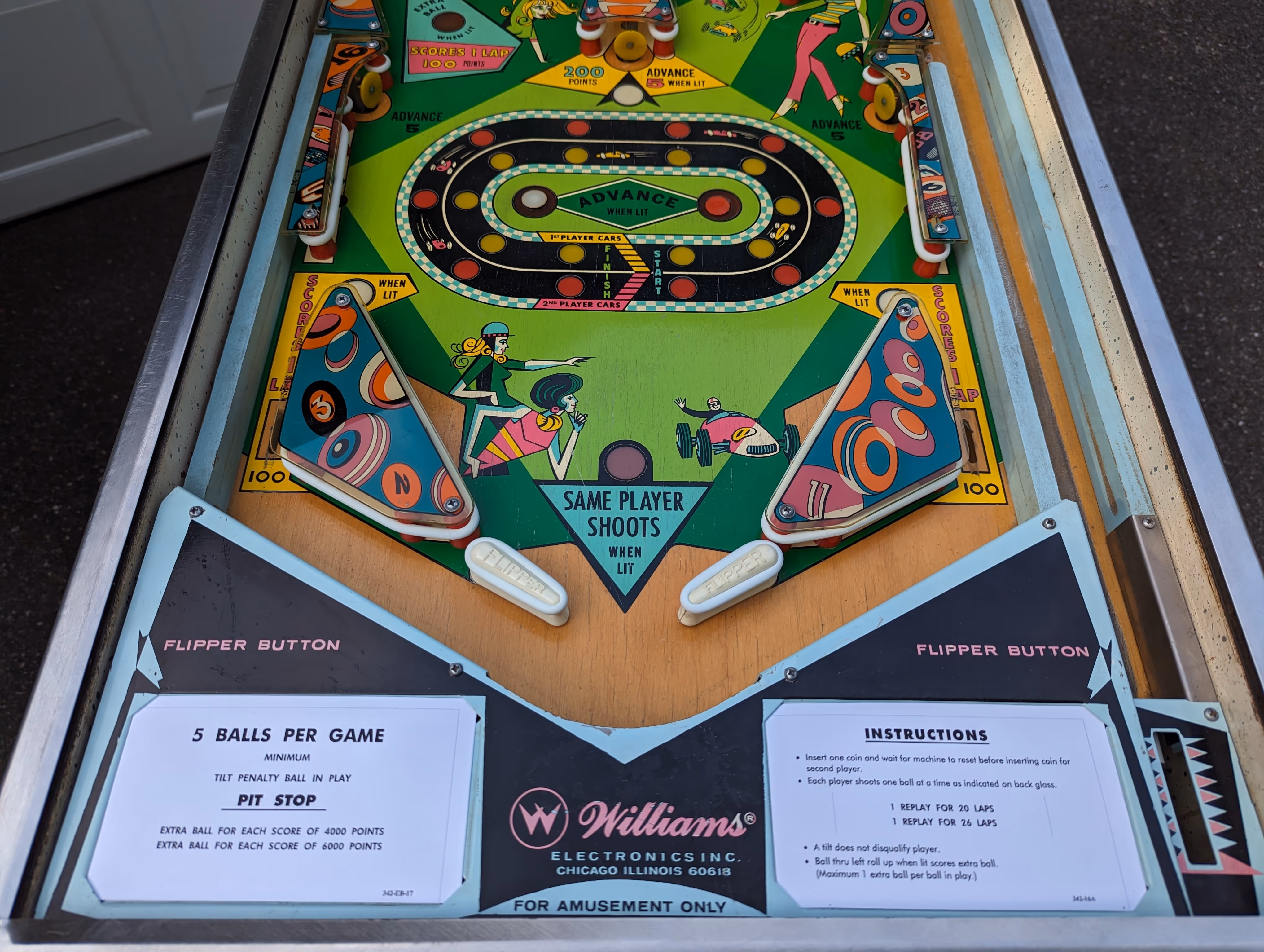 Pit Stop, released by Williams Electronic Games Inc. in 1968, is an electro-mechanical pinball machine designed by Norm Clark with artwork by Christian Marche. With a car racing theme, this two-player game features a unique lap-scoring system where players accumulate laps using separate two-reel displays.