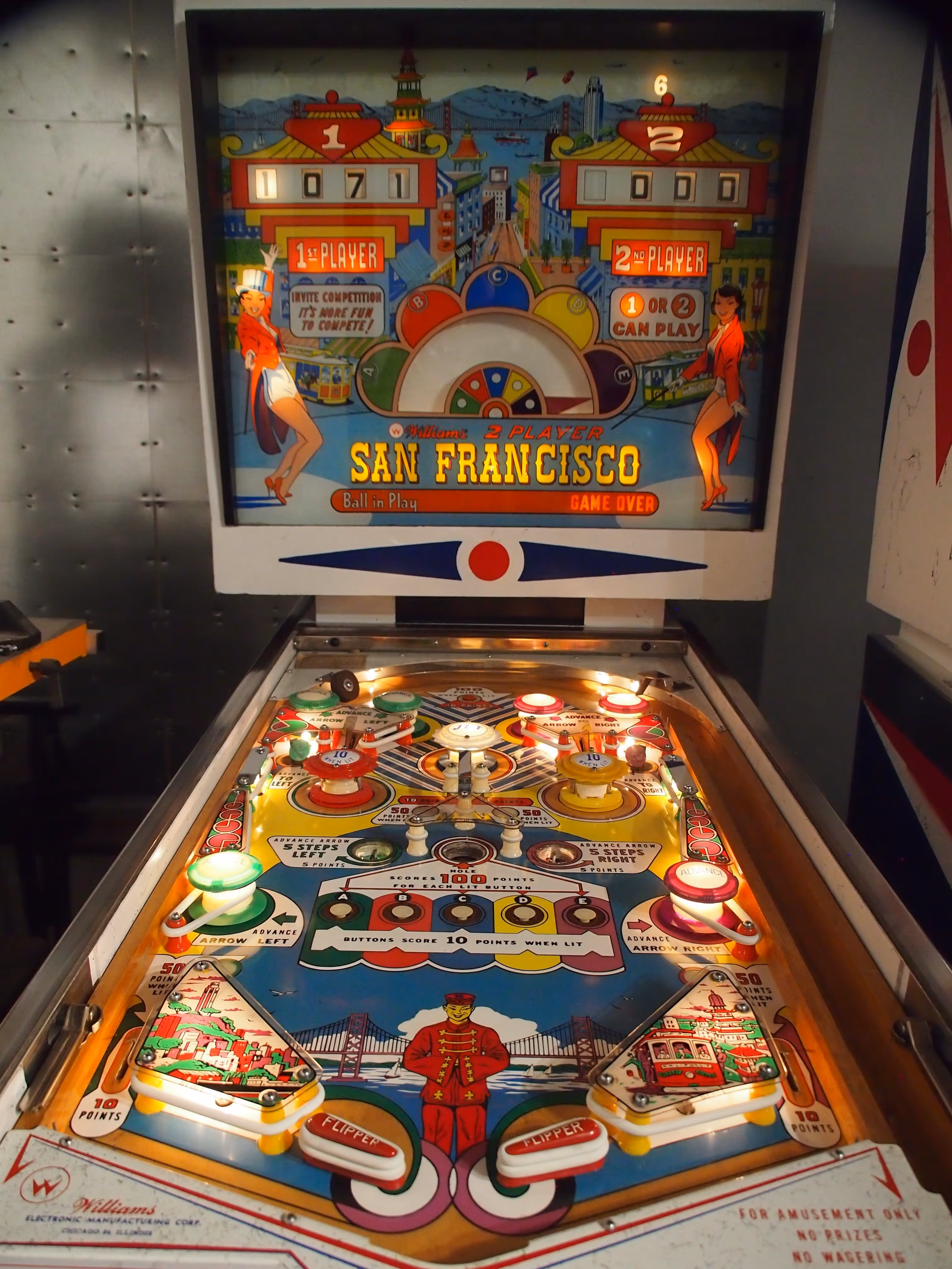 "San Francisco" is a two-player electro-mechanical pinball machine released by Williams Electronic Manufacturing Company in May 1964. Designed by Steve Kordek, with artwork by George Molentin, the game features a vibrant San Francisco theme, capturing the essence of the city's landmarks and culture. The playfield includes two flippers, three jet bumpers, six passive bumpers, two slingshots, six rollover buttons, two standup targets, two kick-out holes, a gobble hole, and a rollunder.