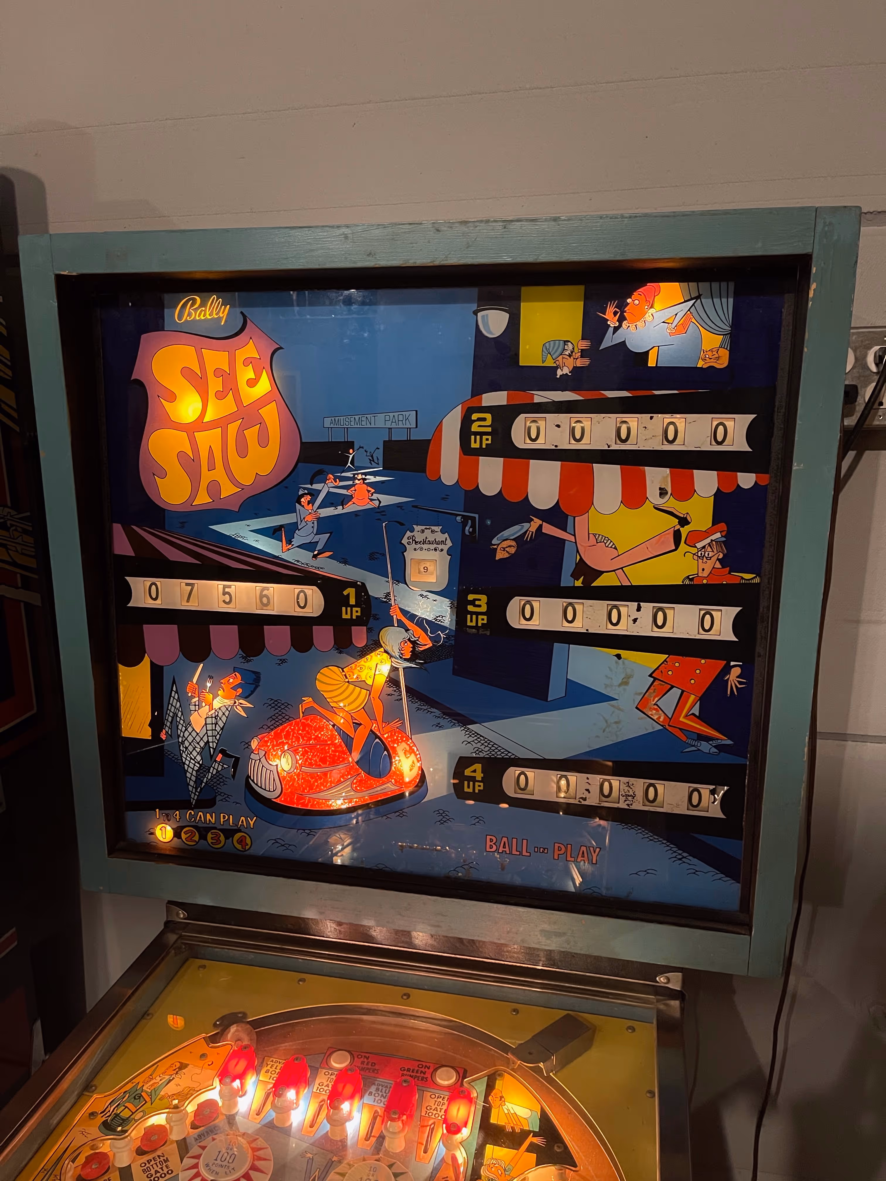 See Saw, released by Bally Manufacturing Co. in September 1970, is an electro-mechanical pinball machine designed by Ted Zale, with artwork by Christian Marche. It features a fun amusement park theme with distinctive gameplay mechanics including two flippers, multiple standup targets, and a challenging playfield design that rewards players with multipliers and bonuses.