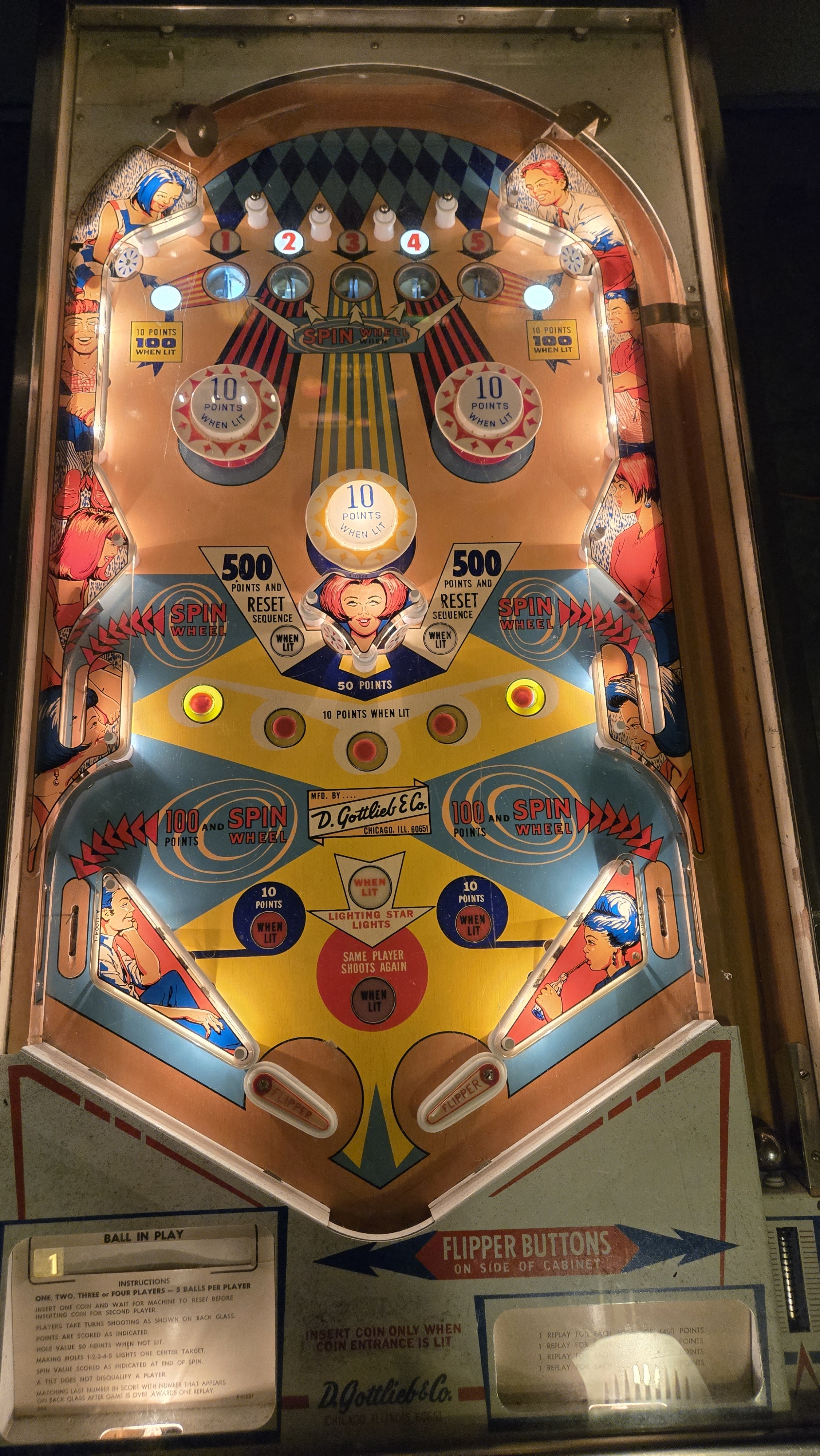 "Spin Wheel" is a four-player electro-mechanical pinball machine released by D. Gottlieb & Co. in March 1968. Designed by Ed Krynski with artwork by Art Stenholm, the game features two flippers, three pop bumpers, and five kick-out holes.