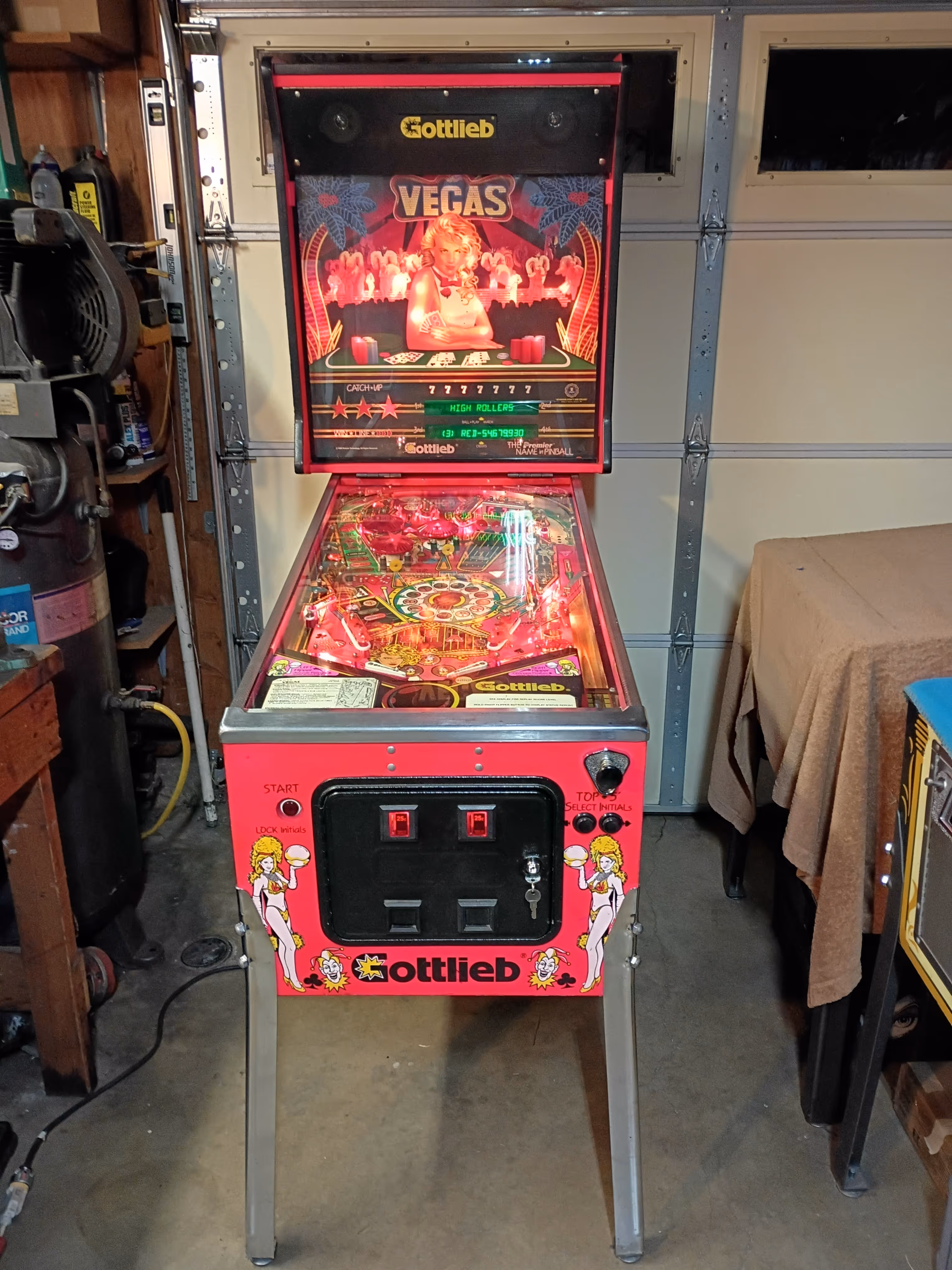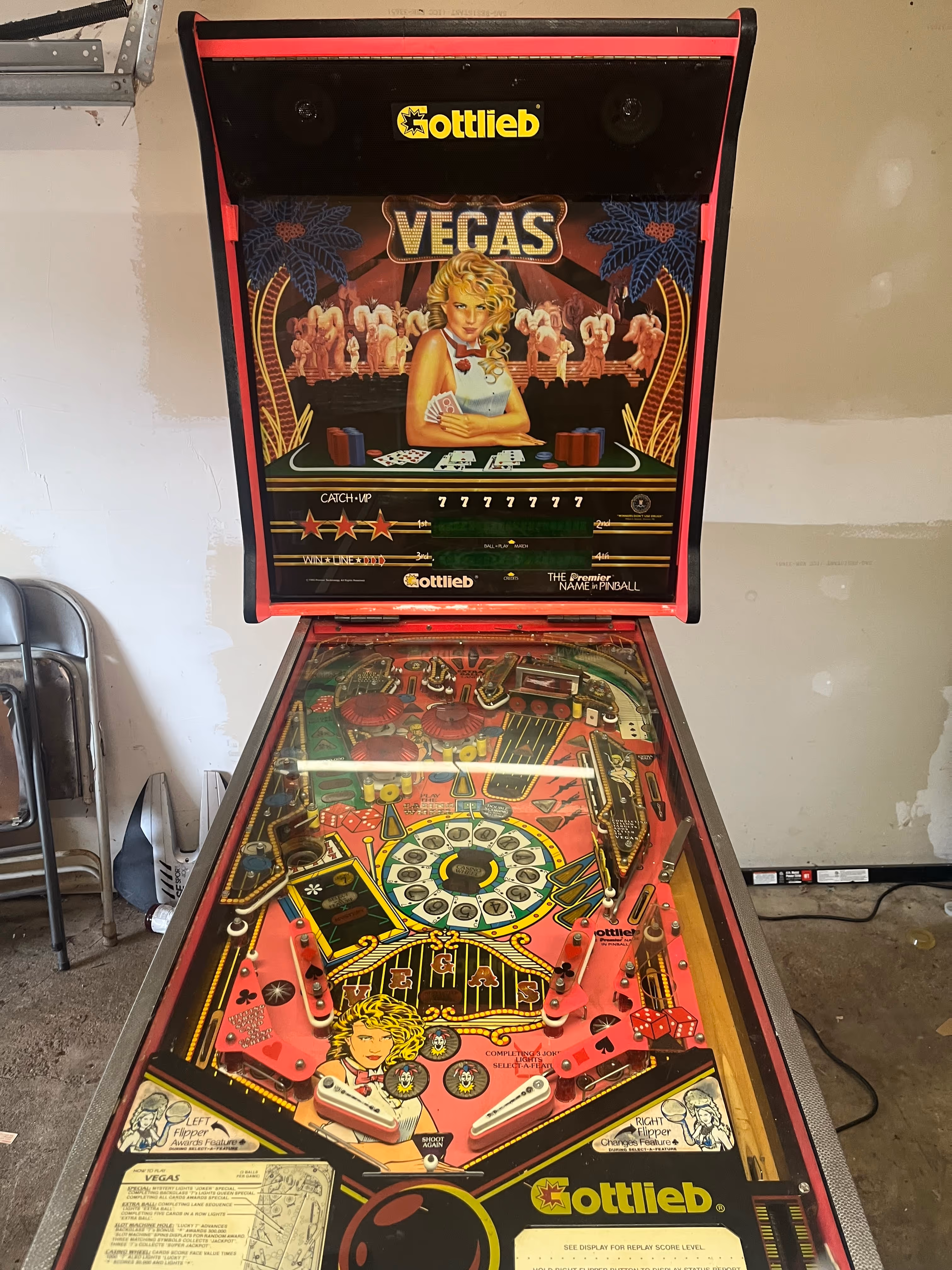 "Vegas" is a pinball machine released by D. Gottlieb & Co. in July 1990, featuring a casino theme. It includes two flippers, no ramps, and a two-ball multiball mode. Part of the Gottlieb System 3 series, it was designed by Jon Norris with artwork by Constantino Mitchell, David Moore, and Jeanine Mitchell. A total of 1,500 units were produced.