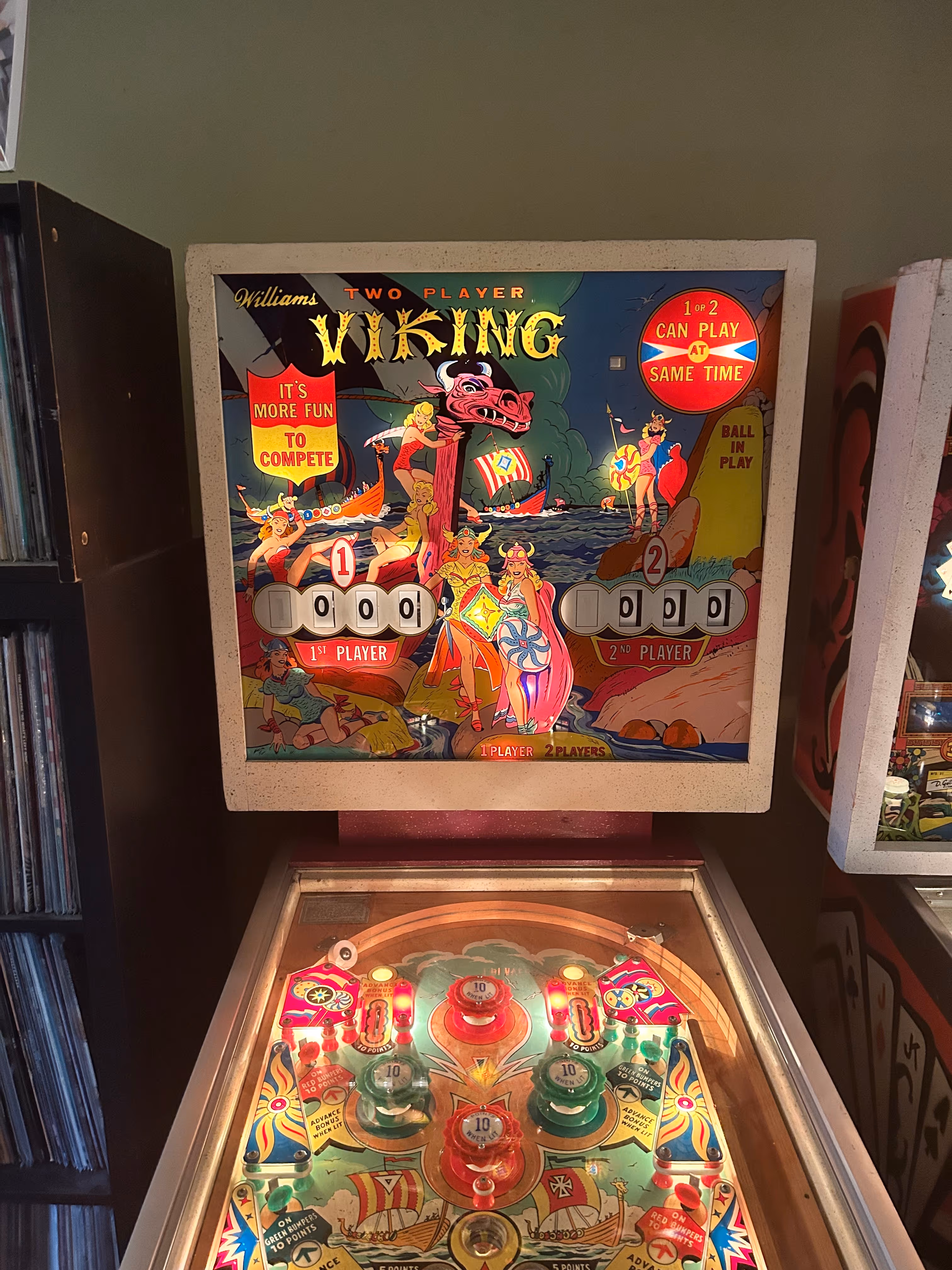 "Viking" is a two-player electro-mechanical pinball machine released by Williams Electronic Manufacturing Company in June 1960. Designed by Harry Mabs, the game features two flippers, four pop bumpers, two passive bumpers, two slingshots, four standup targets, two kick-out holes, and a gobble hole. The machine showcases a distinctive cabinet design known as the "Styling of the 60's," which includes anodized aluminum trim, tapered tubular chromium steel legs, and a built-in shelf with a cigarette holder, allowing players to place drinks while playing.