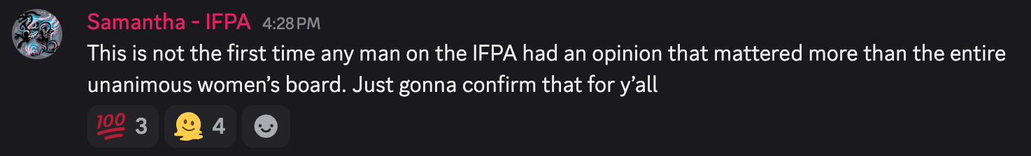 Frankly, it's all a bit bewildering at this stage. Instead of a story of a single failure and an opportunity to learn some lessons for the future, it’s now a story of two failures–one at the event level and one at the organizational level. Until the IFPA explains who made this final call, why the Women’s Board was sidelined, and whether their chosen response meets their own policy standards, this controversy isn’t going anywhere.