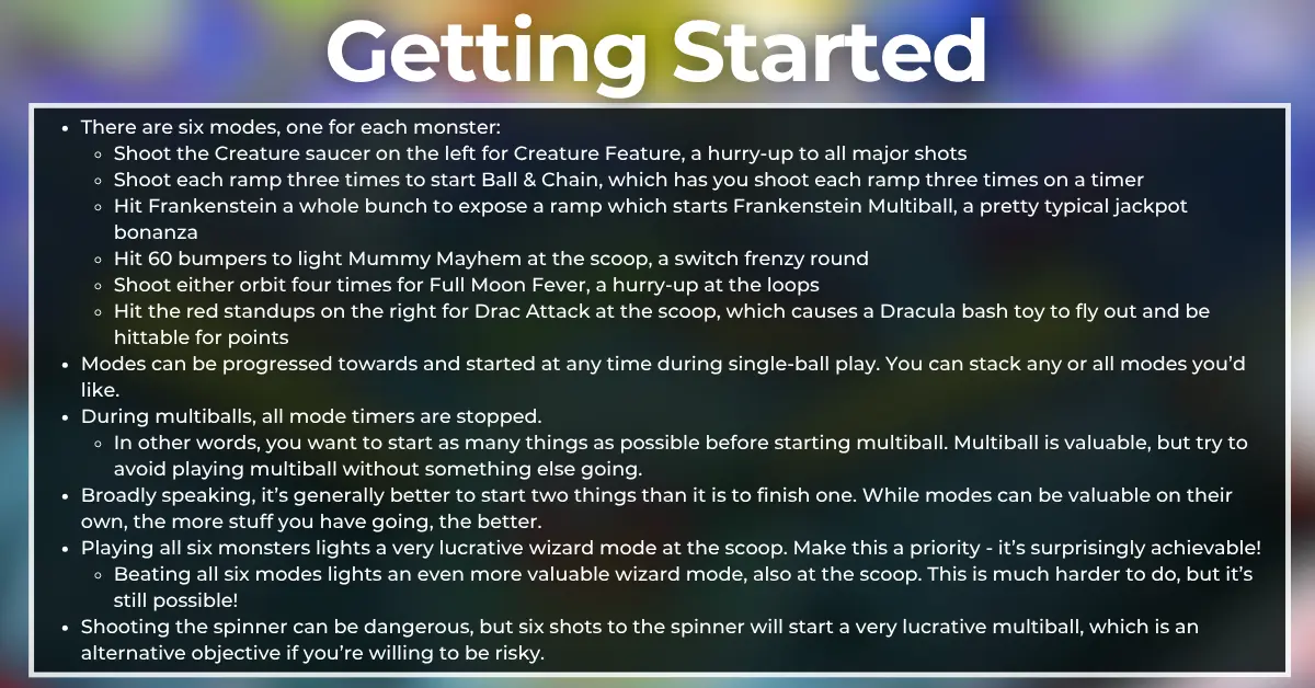 To reiterate: the ideal situation is to light everything, then start everything, then start your multiball. Obviously, that's much easier said than done. I haven't really emphasized this, but every mode is started, and played out, at different shots. So, while you want to get everything going at once, you can only progress towards one thing at a time. The sole exception is Full Moon Fever & Mummy Mayhem, both of which are advance by orbit shots - but even then, Full Moon Fever is way easier to start, and unless you have some ultra-aggressive bumpers, you're likely to see an entire Full Moon Fever play out before seeing your first Mummy Mayhem even light. Not exactly ideal!