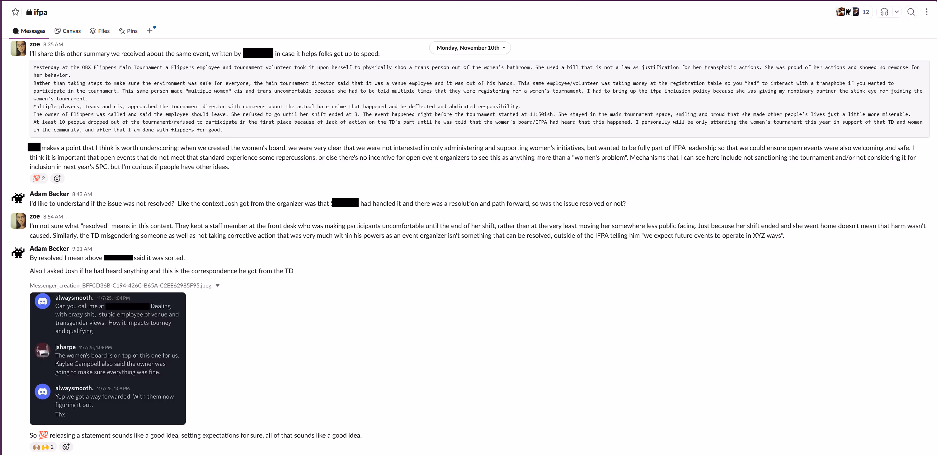 That changed this morning when I reviewed the full internal conversation that was held in the Women’s Advisory Board Slack server, covering the entirety of the discussions held from the first reporting of the incident at Flippers Arcade (which is referenced in the IFPA’s second statement) through the publishing of the IFPA’s initial statement.