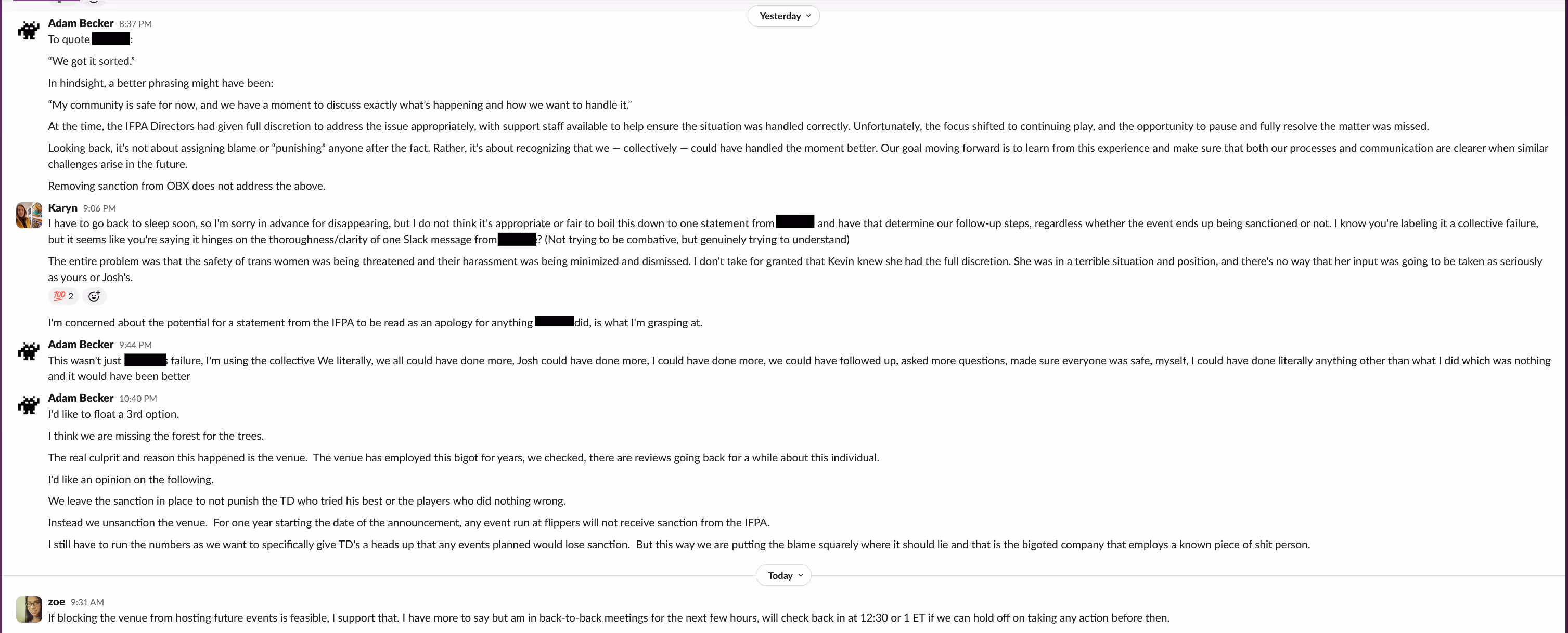 Given the significance of these discussions and the fact that they involve named leaders of a governing body making decisions about a public-facing incident, I have opted to publish the Slack threads in a mostly unredacted form. Two small redactions were made to protect unrelated personal health information and the identities of involved non-leadership players. I have also omitted a section of the conversation that took place on Sunday that discussed unrelated disciplinary issues.
