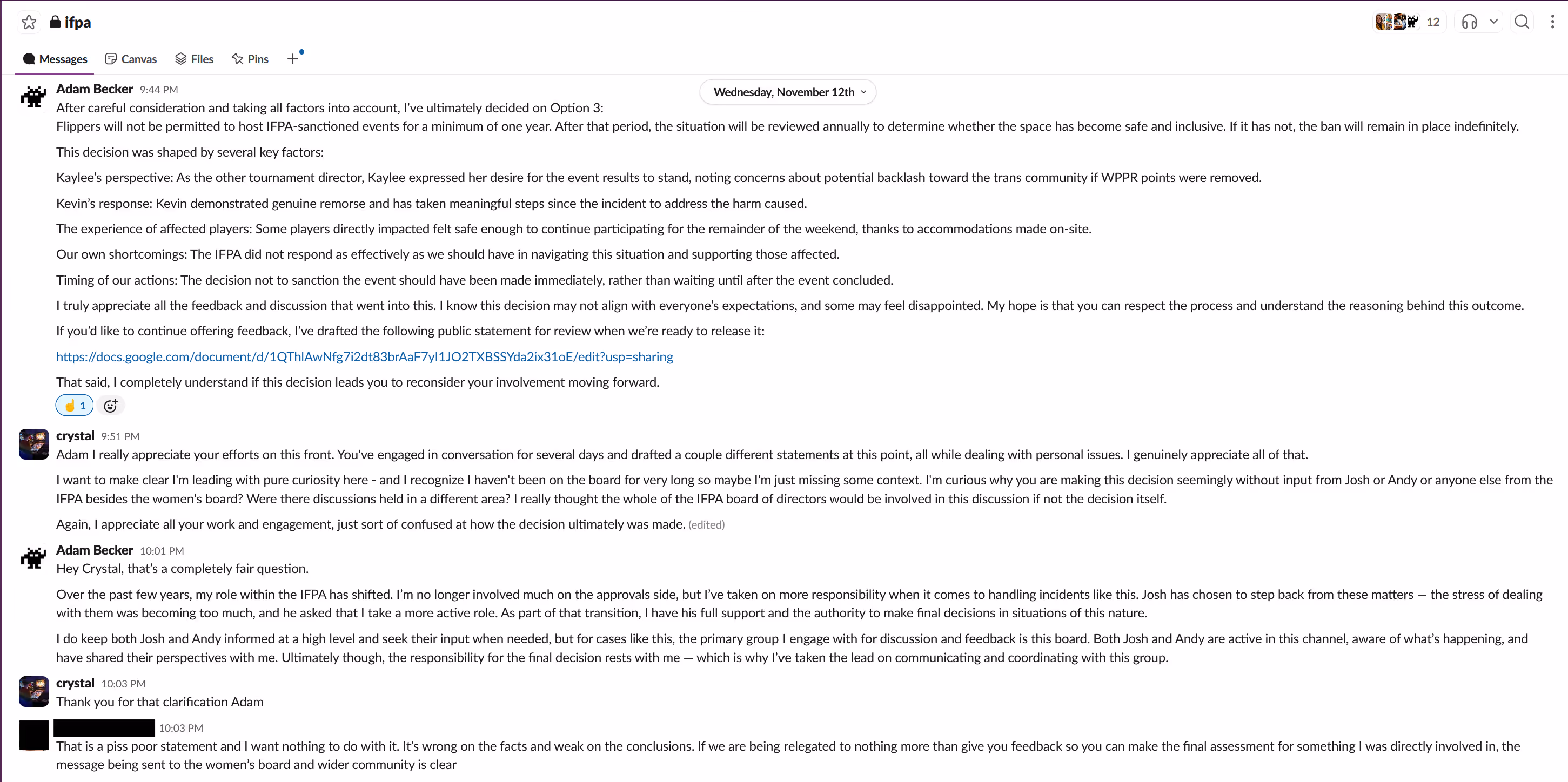 After review and combined with all the other context I have about this incident, regarding the IFPA’s decision-making and motivations for certain communications decisions, a lot more is clear to me now. The logic Adam shared throughout the discussions seems straightforward and easy to follow. At no point does it appear that Adam was acting in bad faith or in a discriminatory or unreasonable manner. Though both Josh and Andy Bagwell are mostly silent in the Slack screenshots, I do not believe either was actively working towards goals of discrimination, silencing viewpoints, or, frankly, bigotry of any form.